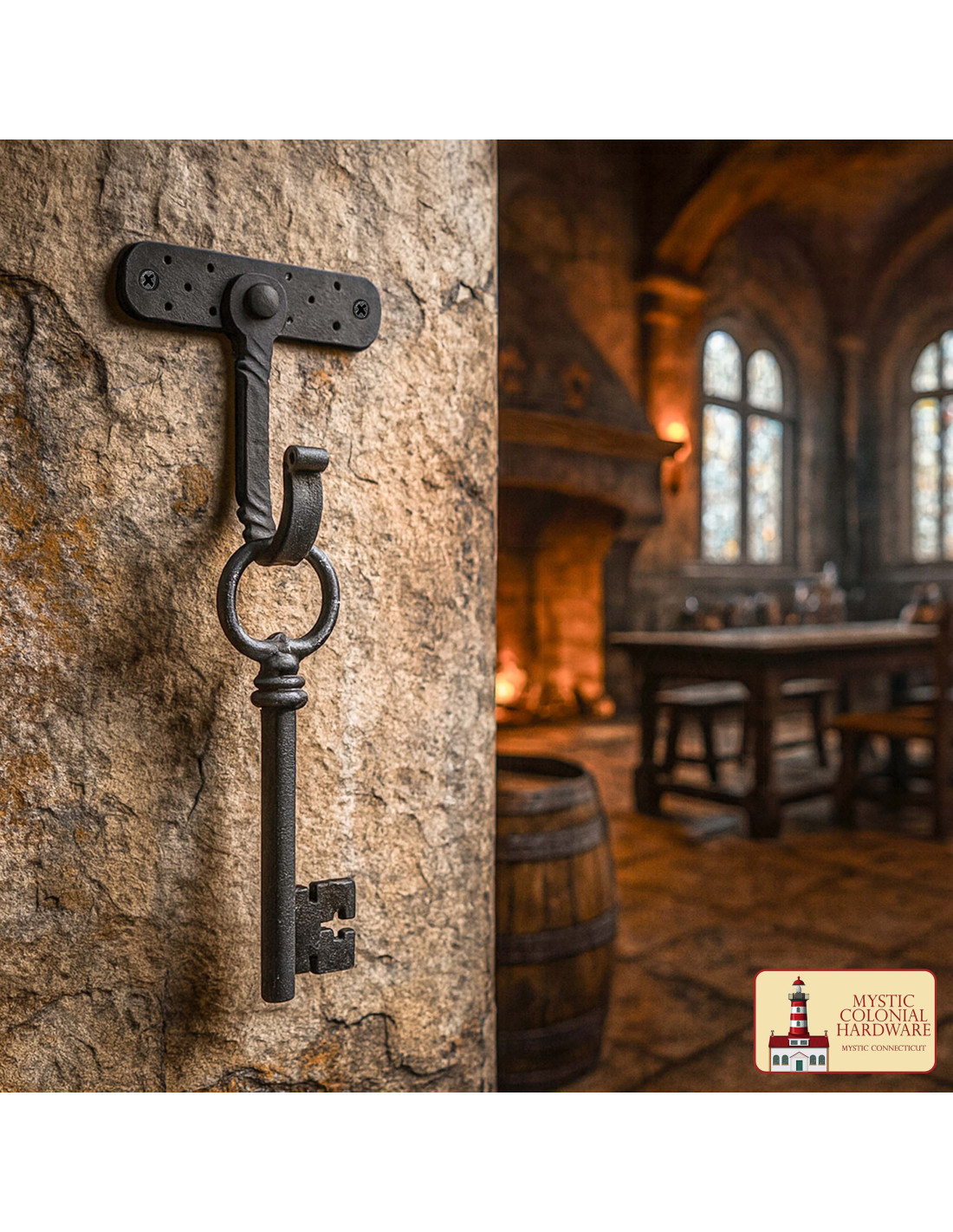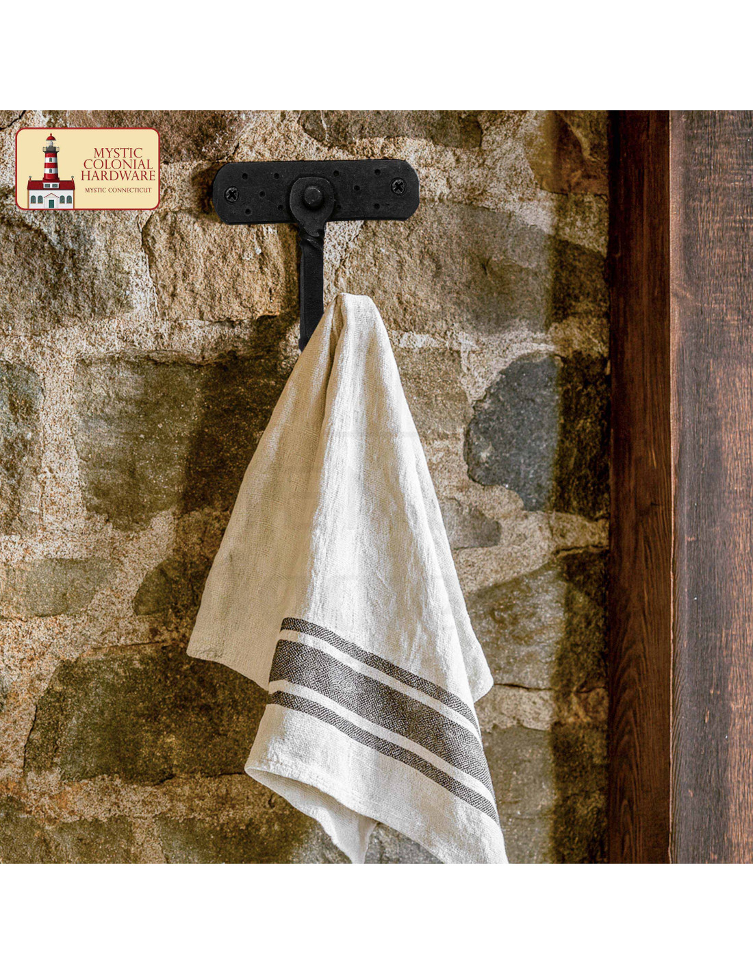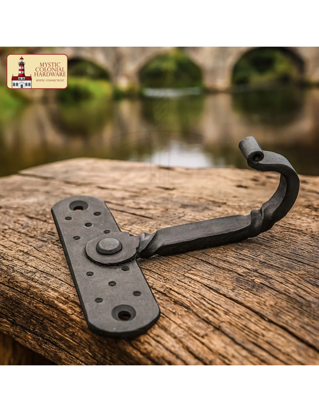 La pièce est réalisée par des forgerons experts, avec une texture martelée et une finition assombrie qui apportent du caractère sans effort. La plaque rectangulaire aux bords arrondis et aux trous pour vis facilite une installation propre, tandis que le bras courbé se terminant par un petit rouleau offre un mouvement fluide grâce à son axe pivotant, ce qui ajoute du confort lors de l'utilisation quotidienne et évite les usures brusques.