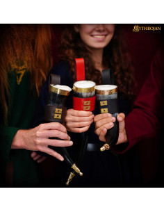 De plus, vous recevrez gratuitement un élégant étui en cuir véritable, conçu pour que vous ayez toujours votre corne à portée de main et que vous puissiez la porter confortablement à votre ceinture à côté de votre hache ou de votre épée. Pour une meilleure protection pendant le transport, nous vous offrons un sac mythologique, garantissant que votre corne arrive en parfait état à chaque aventure.