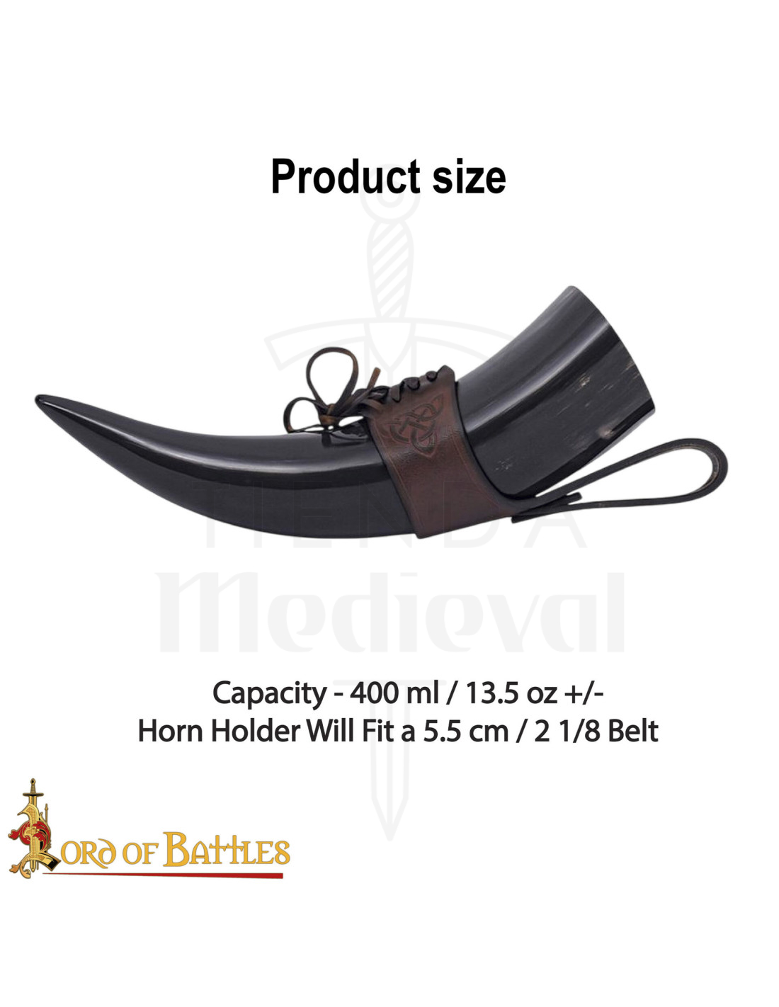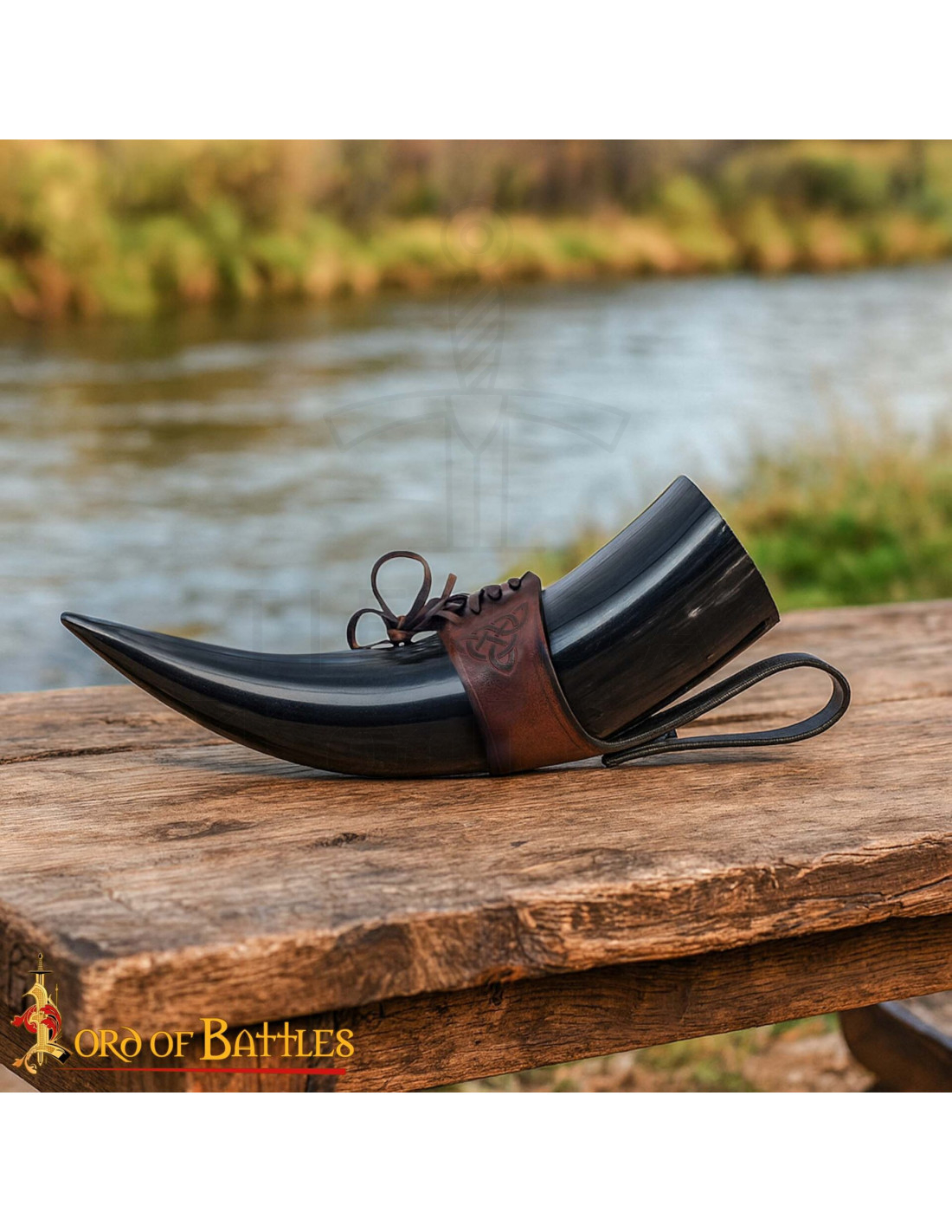Cette corne allie l'authenticité d'une corne de bétail naturel poli, à un étui en cuir marron embossé qui non seulement améliore son esthétique, mais facilite son transport lors des foires, reconstitutions et célébrations. La surface polie reflète la lumière du feu, ajoutant une touche théâtrale lorsque vous levez la coupe, tandis que l'intérieur traité garantit que vous pouvez savourer de l'hydromel ou de la bière en toute sécurité.