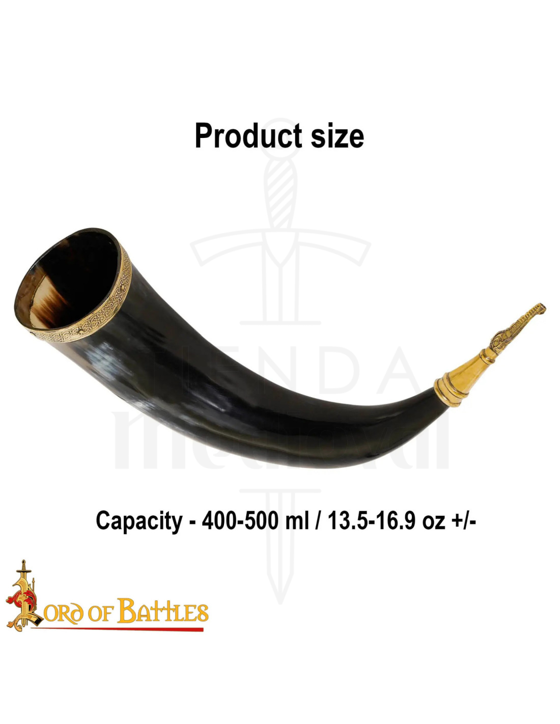 La fonctionnalité fusionne avec le luxe grâce à ses finitions en laiton. Le bord en laiton massif renforce non seulement l'ouverture de la corne, garantissant une durabilité exceptionnelle, mais ajoute également une touche dorée et ornée. La pointe en laiton complète le design, rendant la corne à la fois résistante pour une utilisation fréquente et majestueuse à exposer. Avec une capacité généreuse de 400 à 500 ml, vous pourrez savourer votre hydromel ou votre bière comme un véritable Nordique.