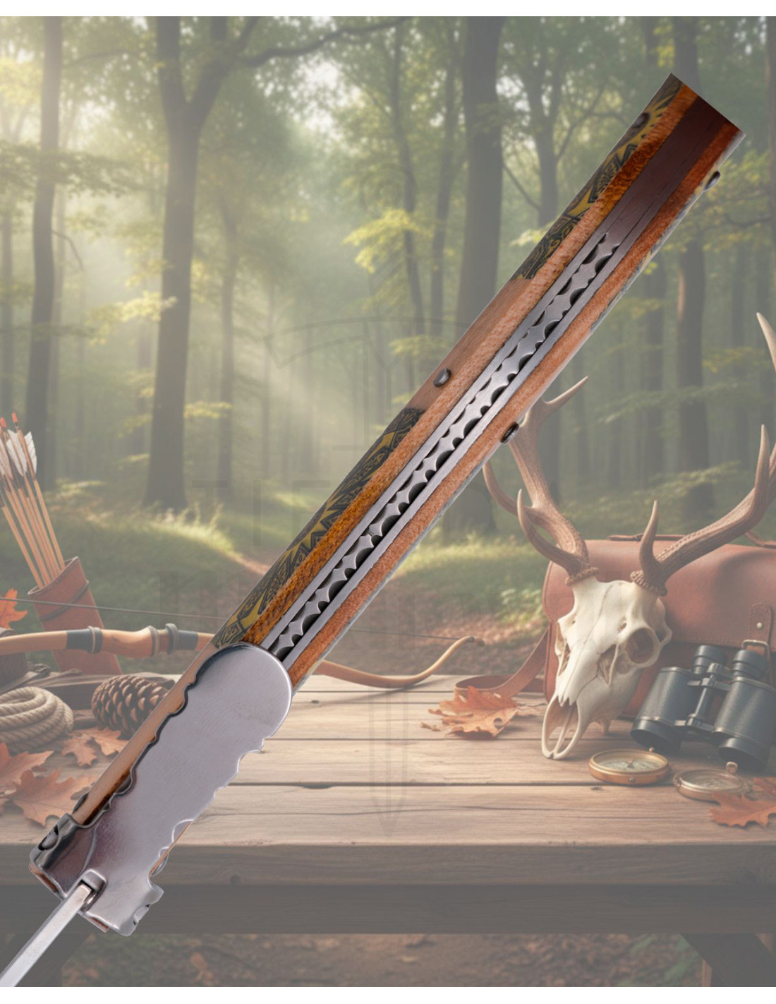 Le manche en bois d'Érable apporte chaleur et motif naturel à chaque prise en main, tandis que l'apprêt en imitation damasquiné en tons dorés et noirs transforme la finition en un détail ornemental avec présence. Cette combinaison séduit non seulement par son aspect visuel, mais facilite aussi une prise en main confortable et sûre, idéale pour une utilisation prolongée ou pour l'exposer dans votre collection.
