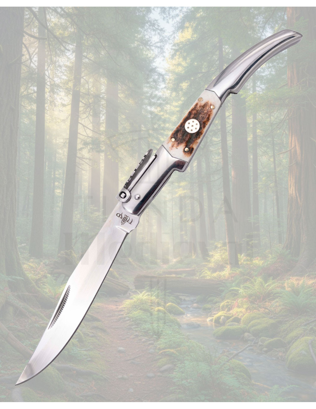 Le manche offre un mélange équilibré de robustesse et de chaleur visuelle grâce aux insertions d'os de cerf authentique avec décoration centrale, qui apportent une prise naturelle et un caractère unique à chaque pièce. Les viroles en acier poli et les rivets métalliques renforcent la structure, donnant une sensation de qualité solide sans renoncer à l'élégance classique.