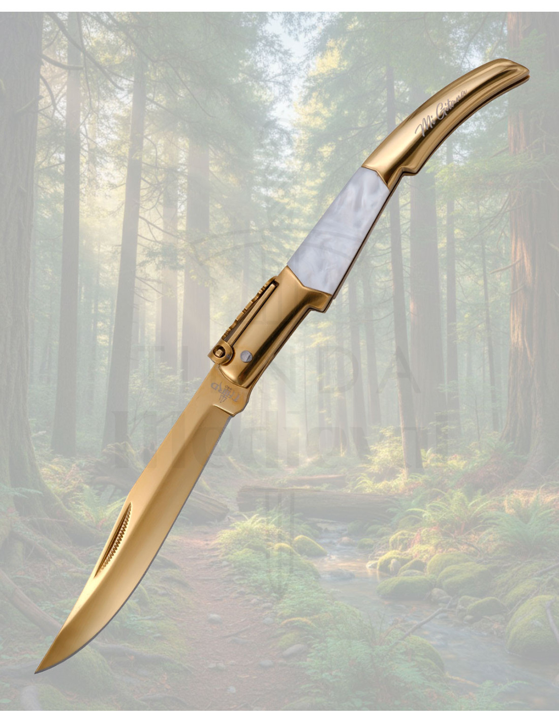 Le Couteau à cran d'arrêt Third Série Mi Gitana Or offre une expérience de prise en main conçue pour se sentir naturelle et sûre, grâce à sa poignée courbée et ergonomique qui facilite la prise en main dans toutes les tâches quotidiennes. Le contraste entre la finition dorée en miroir et l'insertion perlée en acrylique blanc ajoute une touche de distinction, faisant de chaque utilisation une déclaration de style.