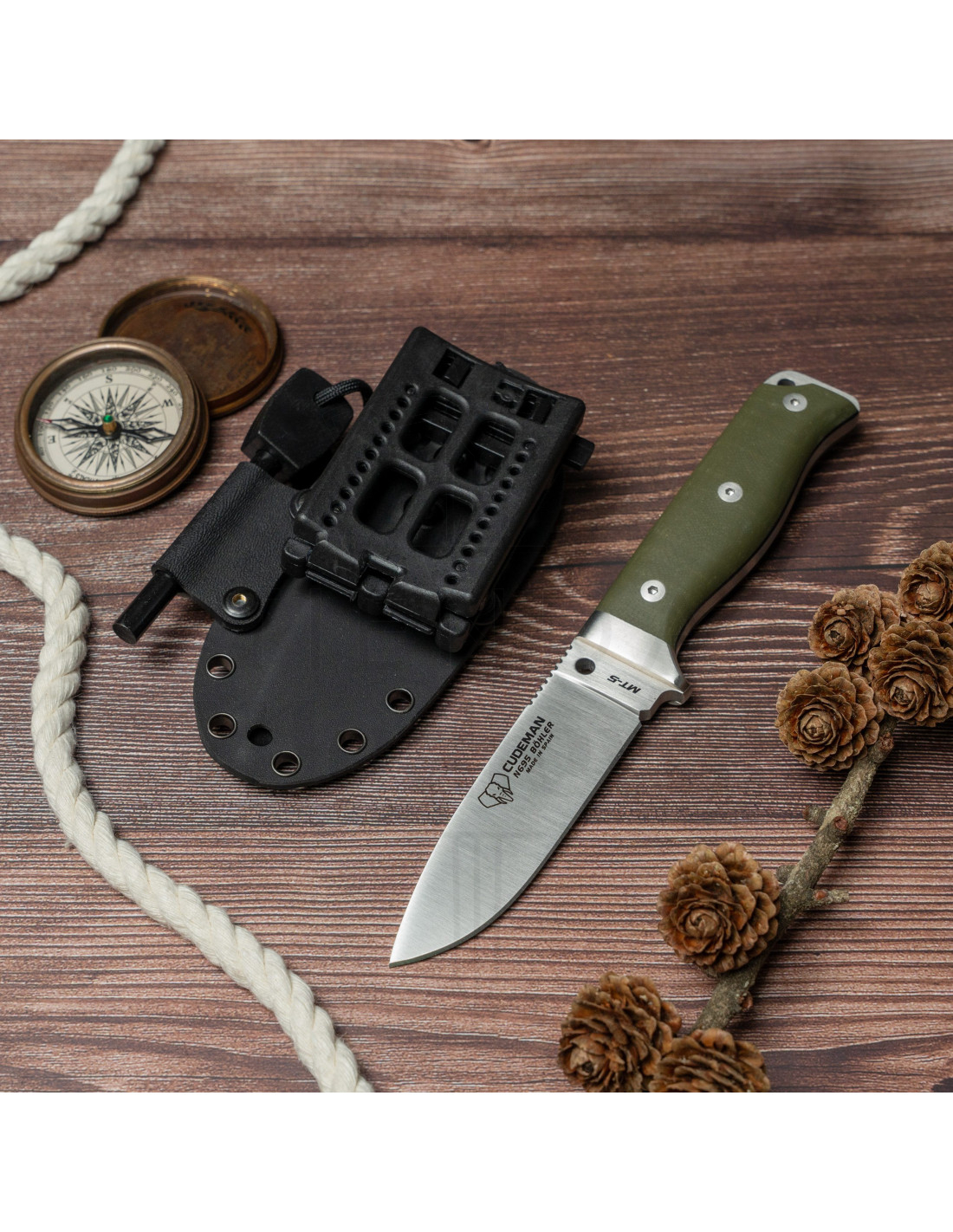 Sa structure monobloc et son épaisseur de 5 mm garantissent durabilité et solidité, tandis que la poignée en G10 vert avec séparateur noir combine résistance et prise en main sûre, complétée par un système d'ancrage avec vis Allen inox et douille filetée en laiton. De plus, il comprend un pommeau percussion pouvant être utilisé en cas d'urgence, ainsi qu'un passant pour cordon de sécurité qui assure une sécurité supplémentaire à chaque utilisation.