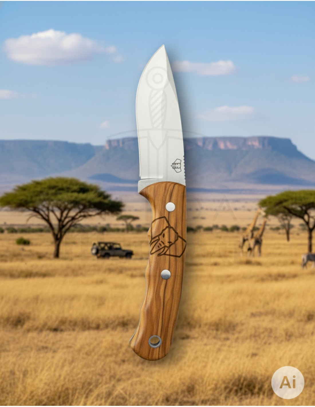 Des détails pratiques qui font la différence : le trou arrière de la poignée est prêt à recevoir un cordon ou un passant, et le passant pour cordon de sécurité permet d’attacher l’outil à votre équipement en toute simplicité. La gravure de style éléphant à la base de la lame et la silhouette stylisée du manche sont des touches esthétiques soulignant leur identité artisanale.