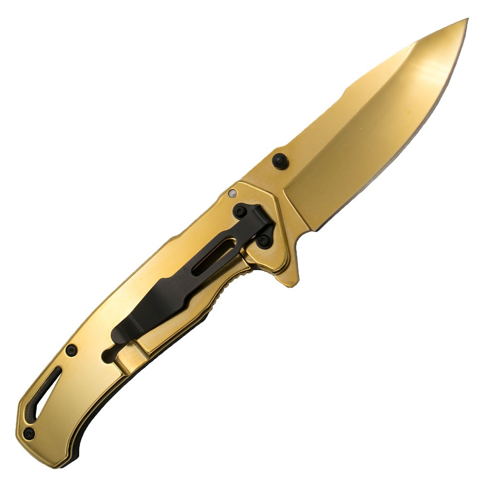 - Lame en acier 420 avec un bain de titane doré solide et tranchant