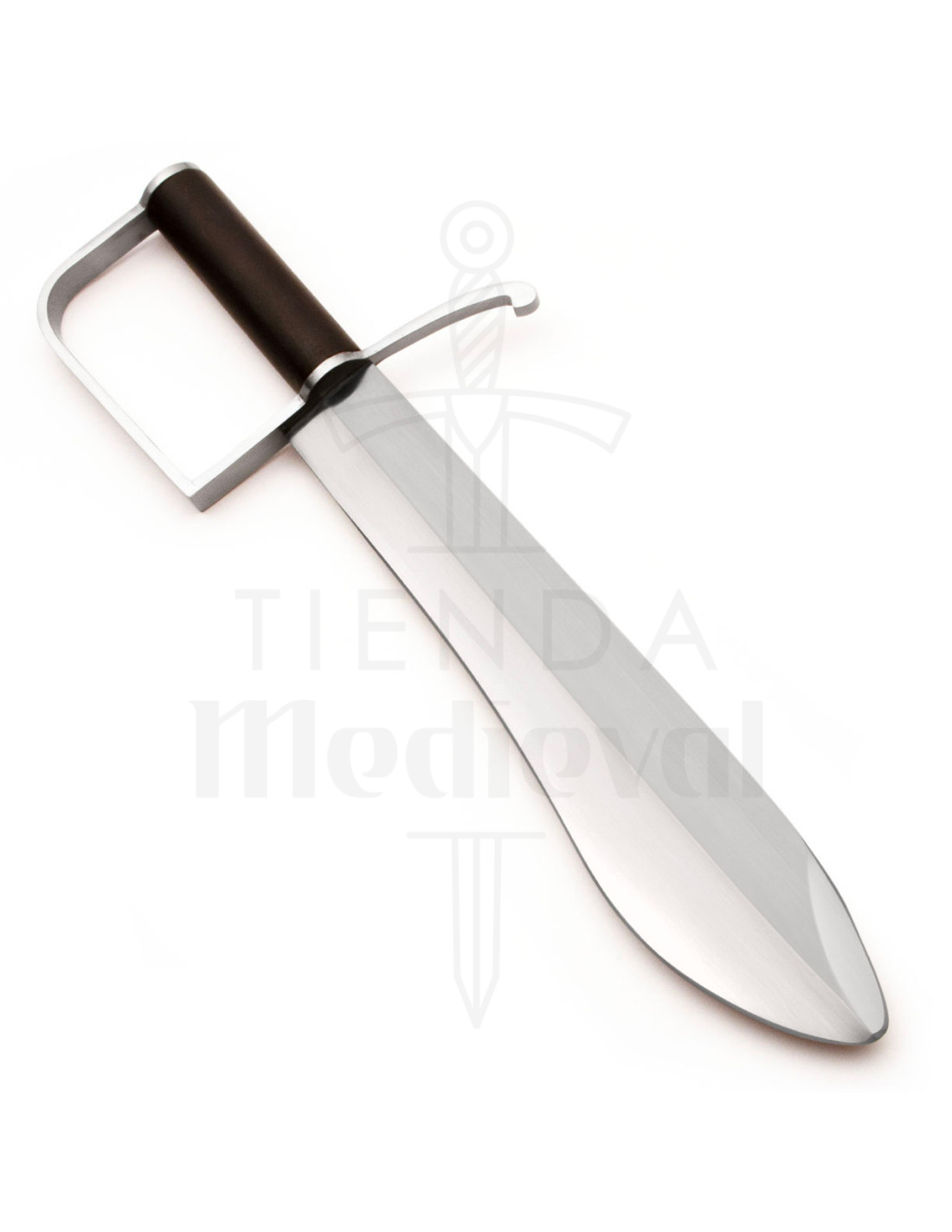 Plus qu'une reproduction, c'est une pièce conçue pour inspirer confiance dans l'utilisation et confort dans le port. La poignée cylindrique, teintée d'un marron foncé, permet une prise naturelle et sécurisée, et la garde avec protection angulaire protège les doigts lors de manœuvres exigeantes. La pointe légèrement arrondie et les biseaux inférieurs creusés permettent des coupes puissantes et contrôlées, transformant la lame en un outil de type machette avec une grande puissance.