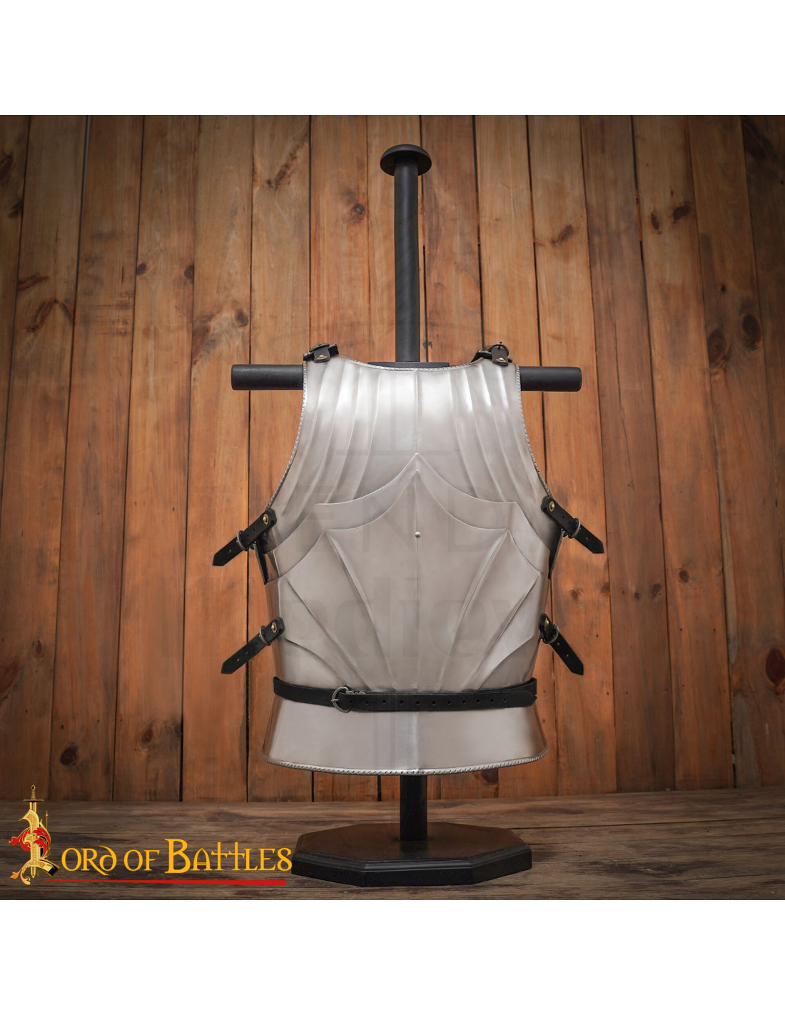Inspirée par l'armure des XVe et XVIe siècles, cette cuirasse reflète l'évolution de l'équipement défensif des chevaliers européens. Son design cannelé, typique de l'époque gothique, offre non seulement un impact visuel impressionnant mais renforce également la structure, offrant une meilleure résistance aux coups sans ajouter de poids supplémentaire. La combinaison de lignes courbes et de détails décoratifs fait de cette pièce un objet à la fois fonctionnel et esthétiquement saisissant.