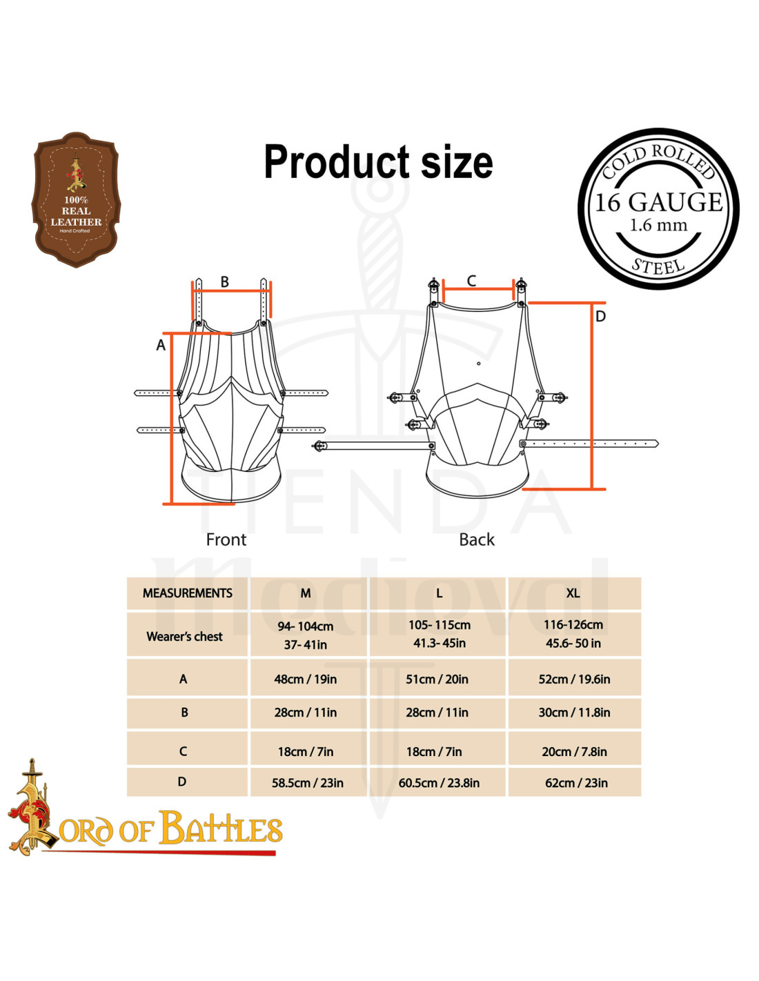 Fabriquée à la main en acier de calibre 16, cette cuirasse pèse environ 6,5 kg, atteignant un équilibre parfait entre durabilité et facilité de mouvement. Sa construction articulée et son ouverture divisée permettent une mobilité agile lors de combats, démonstrations ou événements historiques. De plus, la finition polie protège contre la corrosion, tandis que les sangles en cuir véritable avec boucles assurent un ajustement personnalisé et confortable.