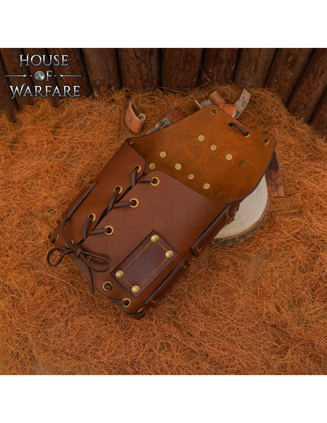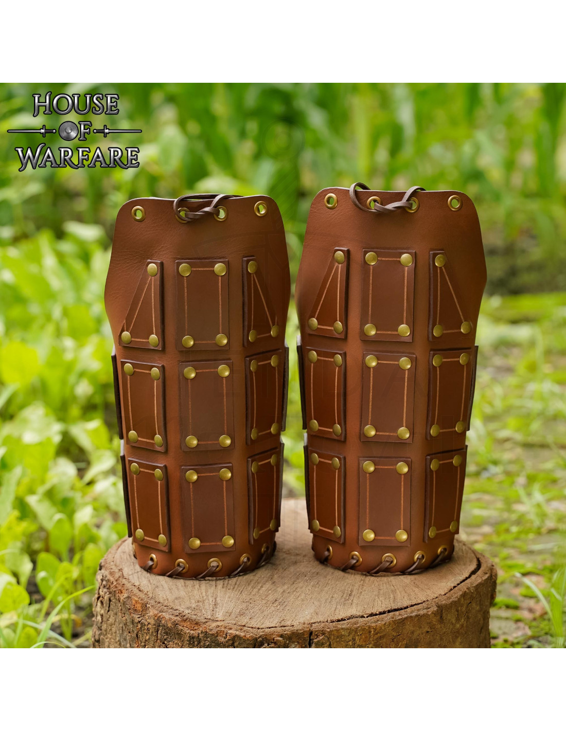 Sur l'image, vous pouvez voir des brassards d'avant-bras en cuir marron avec plaques et rivets dorés, cordons d'ajustement et une légère courbure pour plus de confort, des détails qui reflètent le même langage esthétique et fonctionnel de ce modèle Bohemond, apportant une cohérence visuelle si vous cherchez à compléter votre équipement.