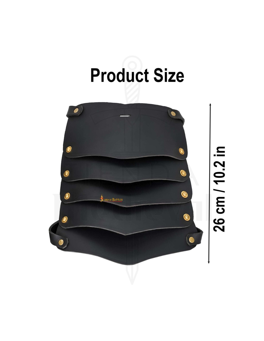 Visuellement, elles se distinguent par une finition sombre et des plaques superposées maintenues par des rivets dorés, un contraste qui met en valeur n'importe quel ensemble, que ce soit sur un gambison, une cotte de mailles ou un costume fantastique. Chaque paire est fabriquée à la main par des artisans, de sorte que chaque pièce présente de légères variations dans la texture et la teinte, ajoutant caractère et exclusivité à votre équipement.