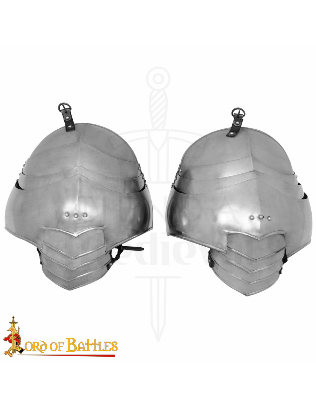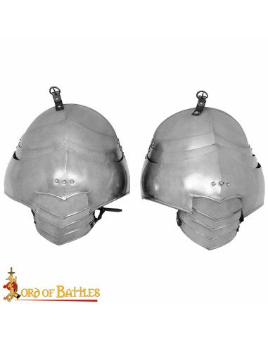 Sur les images, on peut voir un casque métallique composé de plaques articulées, avec une finition argentée polie et des détails fonctionnels tels que des rivets et des charnières, des éléments qui reflètent l'attention aux détails de ce type de pièces. Ce même souci de fabrication se traduit par des épaulières qui allient esthétique historique et mouvement naturel, idéales pour poser, combattre de manière reconstituée ou compléter un costume d'exposition.