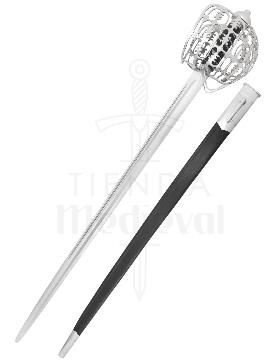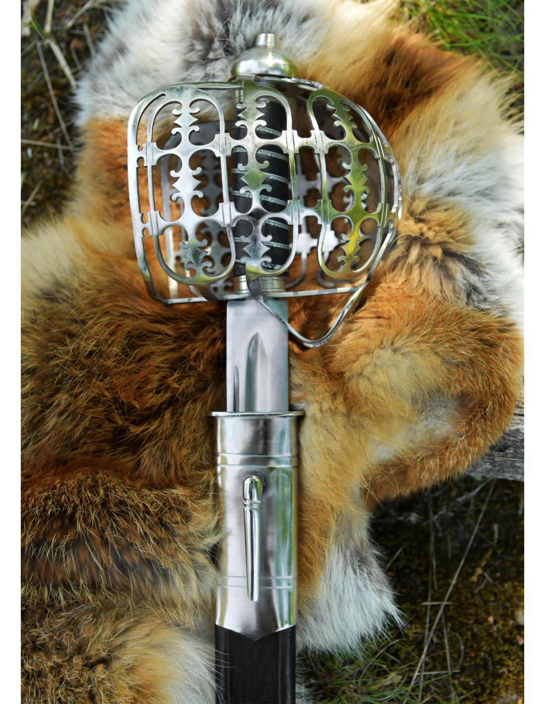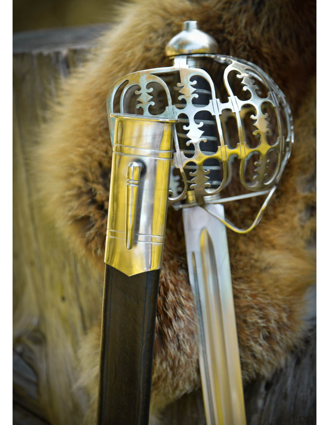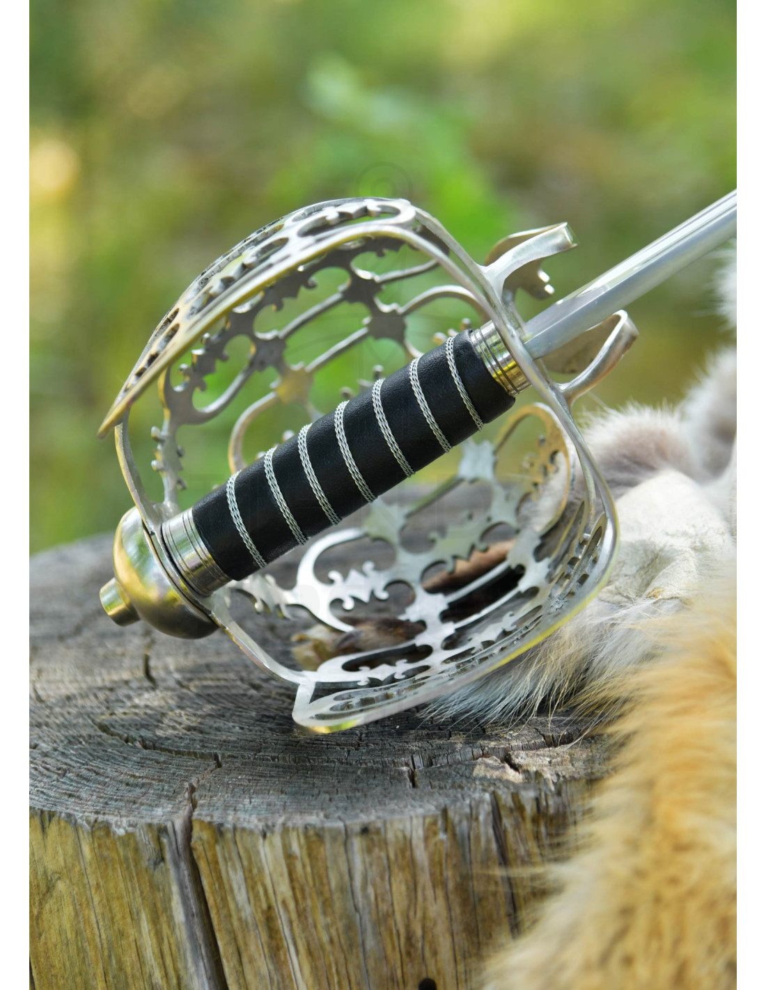 La poignée avec noyau en bois, recouverte de cuir noir et terminée par un enroulement de fil, assure une prise ferme et visuellement fidèle à l'original, apportant chaleur au toucher et un fini historique. La garde de cage en acier, finement ciselée et perforée, enveloppe la main avec un caractère ornamental qui transmet également solidité et protection visuelle.