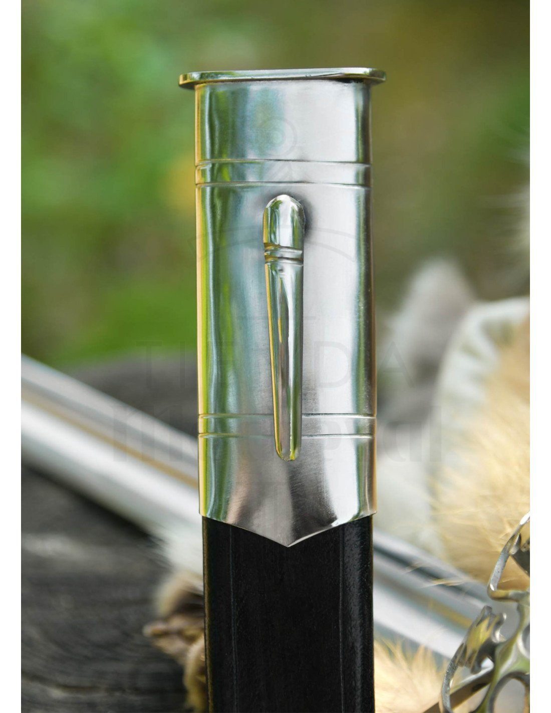 Le fourreau en cuir noir, parfaitement ajusté, est équipé de garnitures en acier sur l'ouverture et la pointe, ainsi que d'une attache métallique supérieure qui souligne son fini soigné, facilitant une présentation impeccable sur un mur, dans une vitrine ou sur un piédestal.