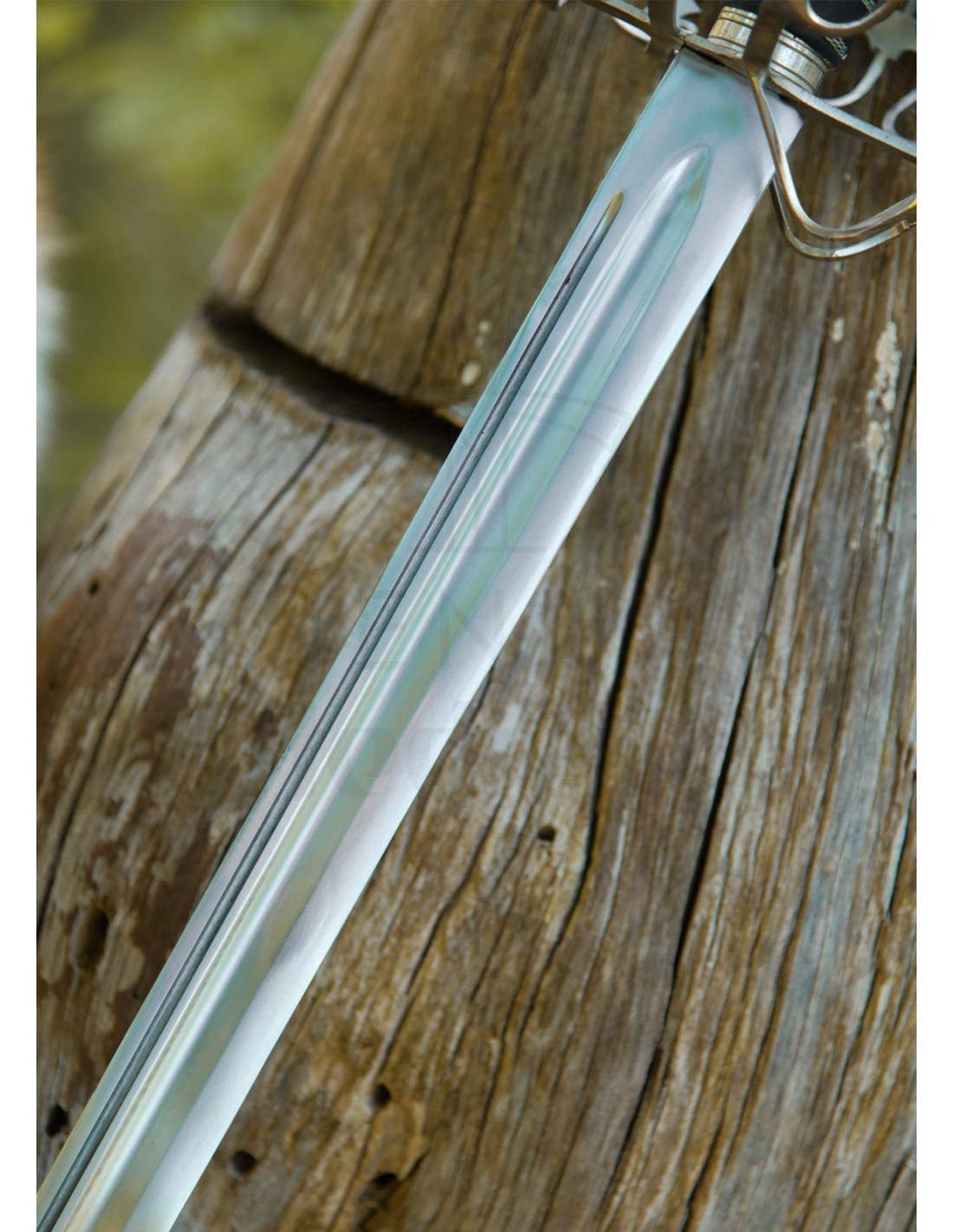 La lame, forgée en acier au carbone C60, offre ce brillant métallique et ce profil classique que les collectionneurs et les reconstituteurs apprécieront, tandis que les plis et les canaux de l'acier rehaussent la silhouette sans lui retirer son élégance. Ce design de la lame apporte une sensation d'équilibre et une esthétique authentique, parfaite pour l'exposition.