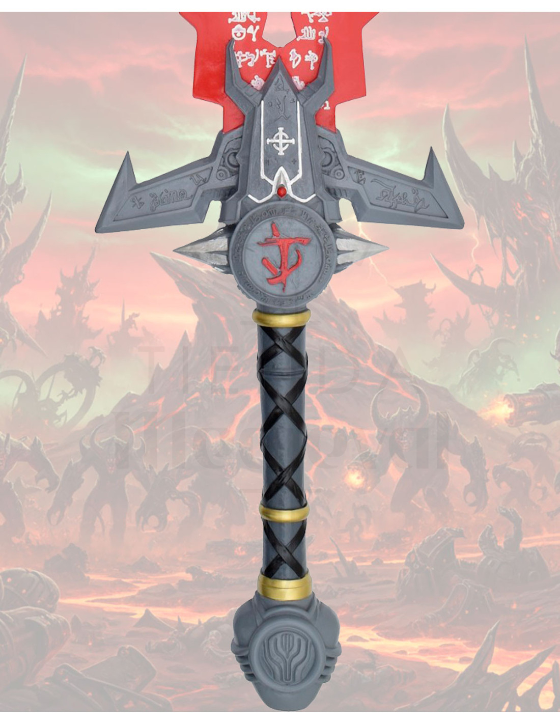 La lame peinte en rouge, parsemée d'inscriptions blanches, fonctionne comme un point focal visuel qui suggère des histoires et des rituels, tandis que ses entailles et reliefs latéraux transmettent une sensation de combat, ajoutant du drame sans compromettre la sécurité ni la facilité de montage.