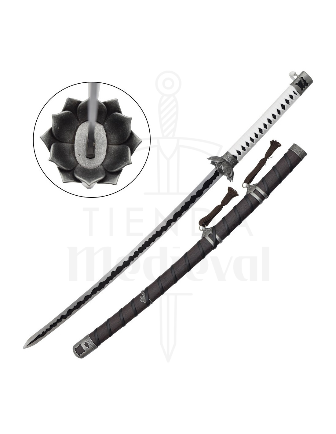 Cette création ornementale capture l'essence de l'univers d'action qui l'inspire, offrant une présence marquante dans n'importe quelle étagère ou vitrine. La combinaison d'une lame en acier et d'un fourreau en bois soigneusement entretenu apporte une apparence authentique, tandis que l'esthétique travaillée - la garde en forme de fleur et le tressage blanc du manche avec un motif en losange - transforme l'objet en un protagoniste visuel, parfait pour ceux qui cherchent à mettre en valeur leur collection.