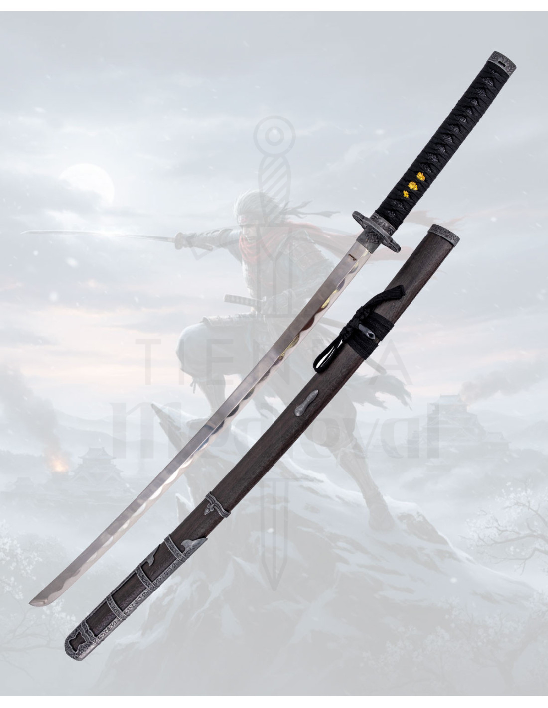 Le fourreau, de finition sombre type bois, intègre des détails métalliques décoratifs également en relief, qui élèvent la présentation et protègent la katana lors du transport. La corde noire nouée autour du fourreau ajoute une fonctionnalité pour sécuriser la pièce et facilite son transport, gardant tout en ordre et avec une allure traditionnelle.