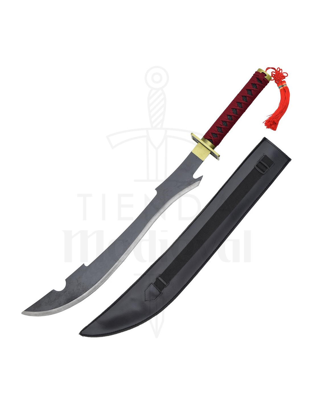 La lame métallique, avec son ton gris profond et ses découpes décoratives, apporte une ambiance agressive sans perdre en sécurité, car le fil est émoussé, pensé uniquement pour l'exposition et l'utilisation lors d'événements. Sa forme courbée et le fourreau assorti, adaptés à cette courbure, facilitent son transport et permettent de l'afficher au mur ou sur un support avec une grande stabilité.
