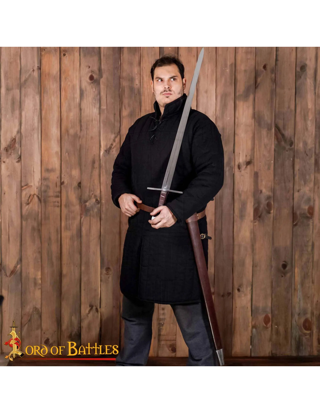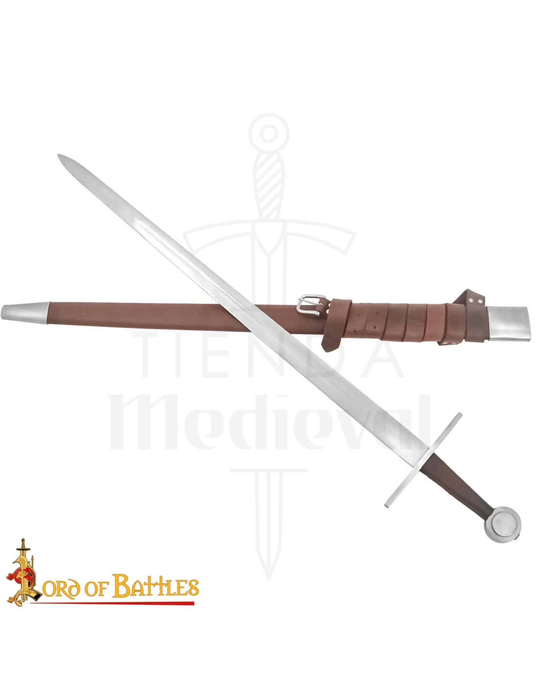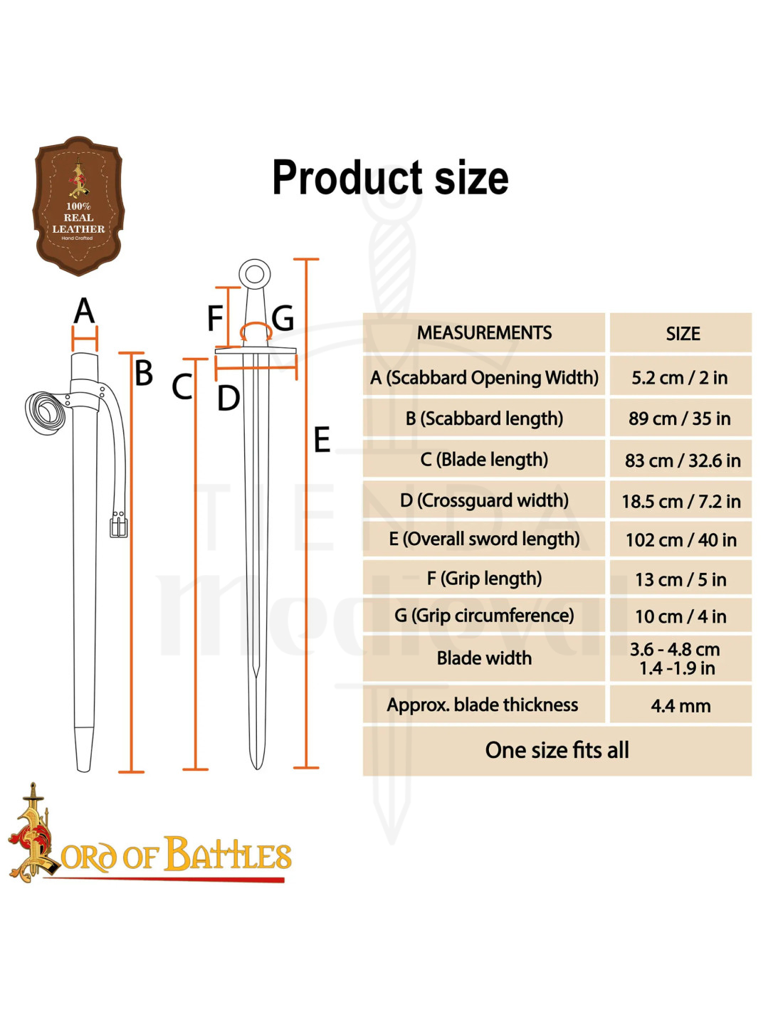 Le fourreau, avec une couverture en cuir marron et des finitions métalliques, protège la pièce et facilite son transport. La courroie ajustable avec boucle intégrée permet de la porter confortablement et en toute sécurité sur la ceinture ou sur le corps, idéale pour les recréations, les répétitions et les expositions. Inspirée par les épées normandes des Xe au XIIe siècles, elle apporte une connexion visuelle et émotionnelle avec cette époque, parfaite pour les collectionneurs et les professionnels qui apprécient la fidélité historique et la fonctionnalité.