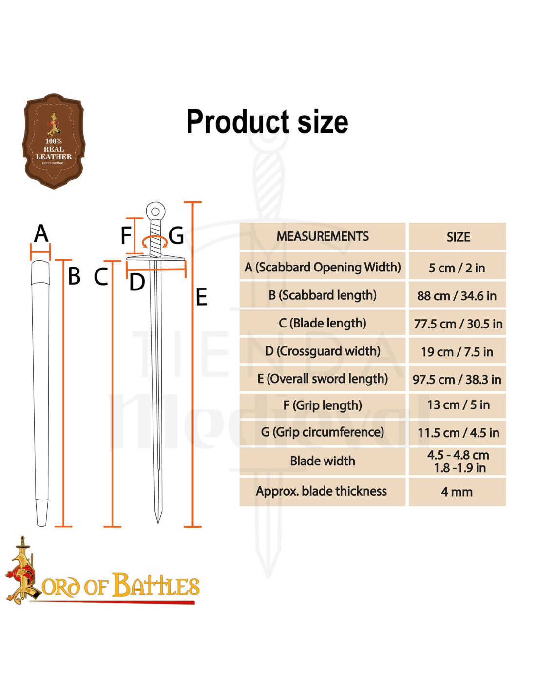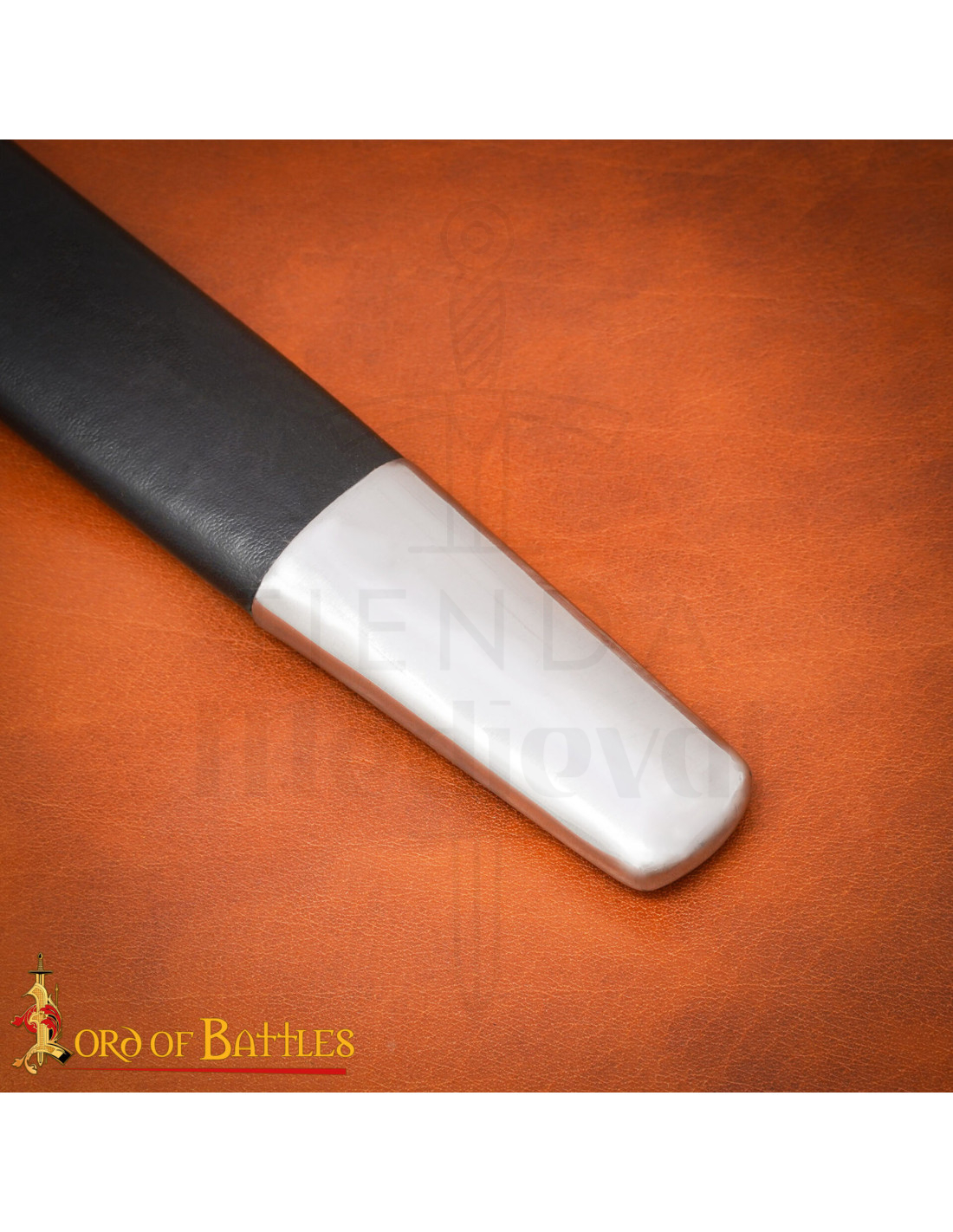 Chaque épée naît du travail expert du forgeron, avec une lame en acier traitée pour supporter une utilisation contrôlée, sans avoir besoin d'une lame aiguisée, vous permettant de répéter avec confiance. Le design droit et la finition métallique satinée apportent une présence visuelle et facilité d'entretien, tandis que la garde rectangulaire et le pommeau en métal forge apportent fermeté et résistance à chaque manœuvre. La poignée enveloppée de cuir assure une prise confortable et stable, idéale pour des séances prolongées sans que l'épée ne devienne inconfortable.