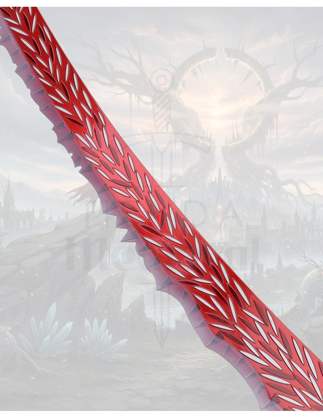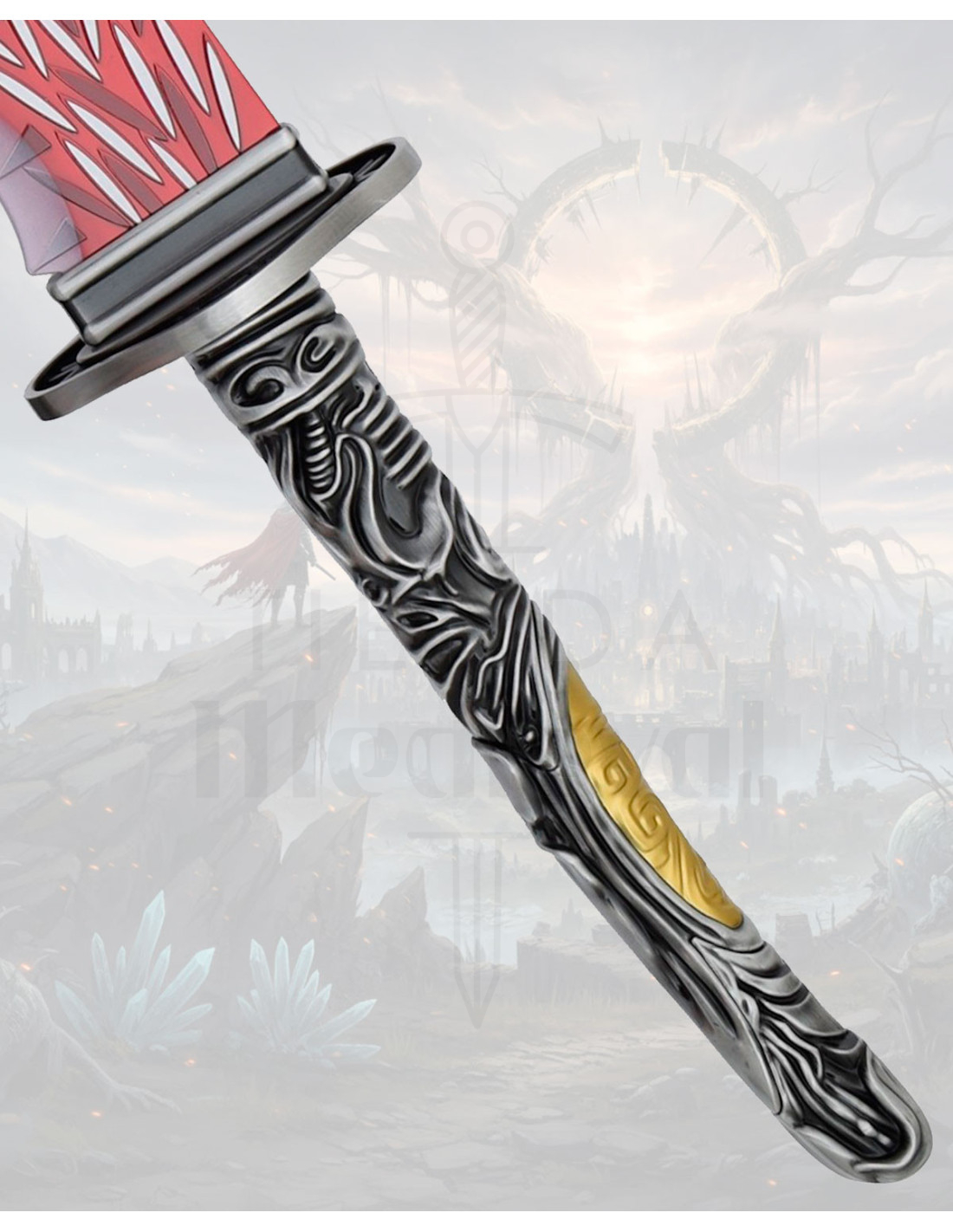 La Grande épée ornementale du Chasseur de Dragons, Elden Ring, arrive avec une finition qui attire tous les regards : une lame courbe aux teintes rouges décorée de motifs blancs évoquant des plumes, et un tranchant avec des détails festonnés et des pointes qui transmettent du mouvement même au repos. Ce design soigneusement pensé apporte une présence dramatique, parfaite pour être exhibée dans un salon, un bureau ou un coin gamer, et pour ceux qui recherchent une réplique avec du caractère qui complète leur mise en scène ou leur collection thématique.