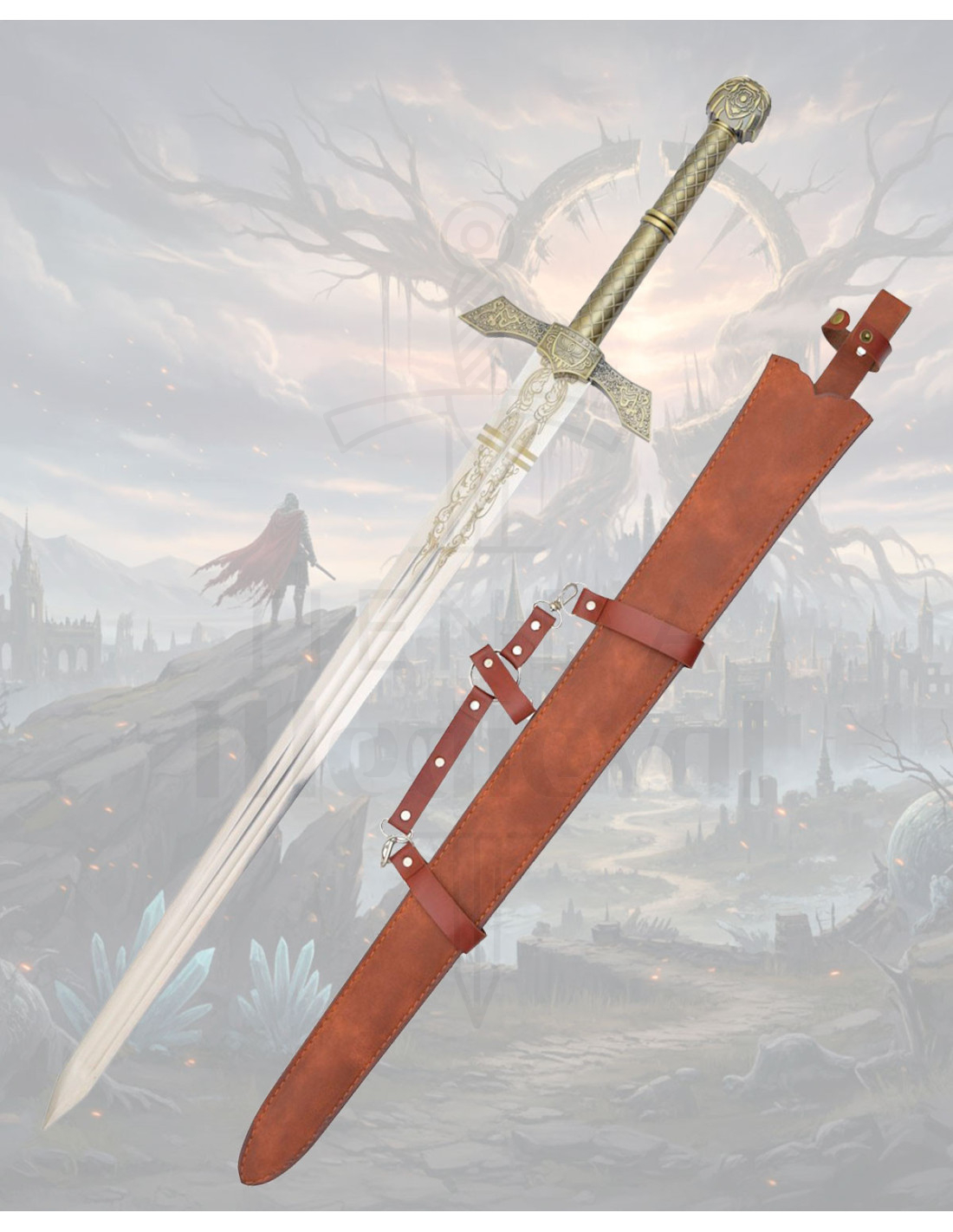 La garde large, également en finition dorée ornée, renforce non seulement l'esthétique imposante, mais équilibre également visuellement la pièce, donnant l'impression d'une épée forgée pour un chevalier légendaire. Le fourreau en cuir marron avec des couture visibles et des sangles ajustables facilite son transport et sa sécurisation avec un fermoir métallique, idéal pour ceux qui recherchent une pièce combinant exposition et fonctionnalité pratique.