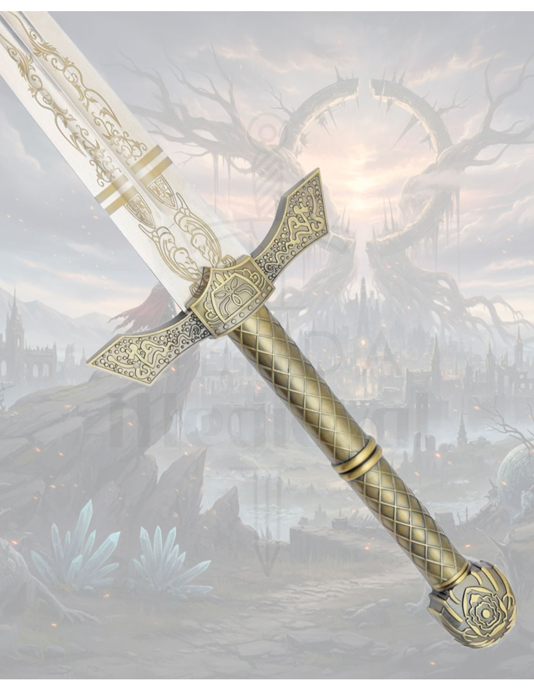Avec une lame métallique à double tranchant et des gravures ornementales au centre, cette réplique transmet authenticité et présence sans nécessiter d'expérience de manipulation, parfaite pour être accrochée au mur ou pour accompagner une tenue d'événement. La poignée de ton doré, avec un motif entrelacé rappelant des losanges et un pommeau en relief floral, offre une prise qui semble conçue pour être fière au contact, apportant une sensation de qualité et de raffinement.