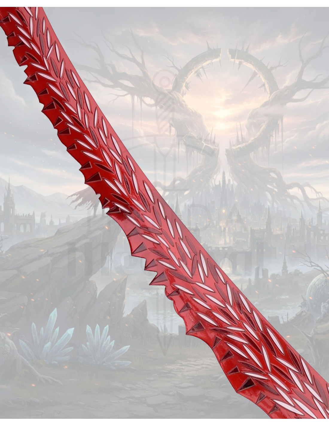 La lame incurvée, peinte en rouge avec des motifs pointus et des lignes qui dessinent le mouvement, crée un effet dramatique qui attire tous les regards. Ce bord dentelé et ses coupes irrégulières apportent non seulement un caractère visuel, mais véhiculent également une sensation de puissance et de détail, parfaite pour quiconque cherche une pièce décorative avec présence et personnalité.