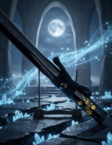 Visualise entre tes mains la longue lame courbe, avec son motif ondulé qui reflète mouvement, énergie et beauté. La poignée enveloppée de tissu noir, qui encadre un design distinctif, évoque contrôle et domination. Le tsuba en noir et le lien en haut du fourreau renforcent cette sensation de pouvoir et de précision, faisant de ta présence un point central avec chaque détail. Le fourreau brillant décoré d'or révèle que tu ne combats pas seulement, mais que tu conquiers chaque étape avec détermination, élégance et caractère. La Katana Moonveil devient bien plus qu'une réplique, c'est ta propre déclaration de style et une phase supérieure de pouvoir.
