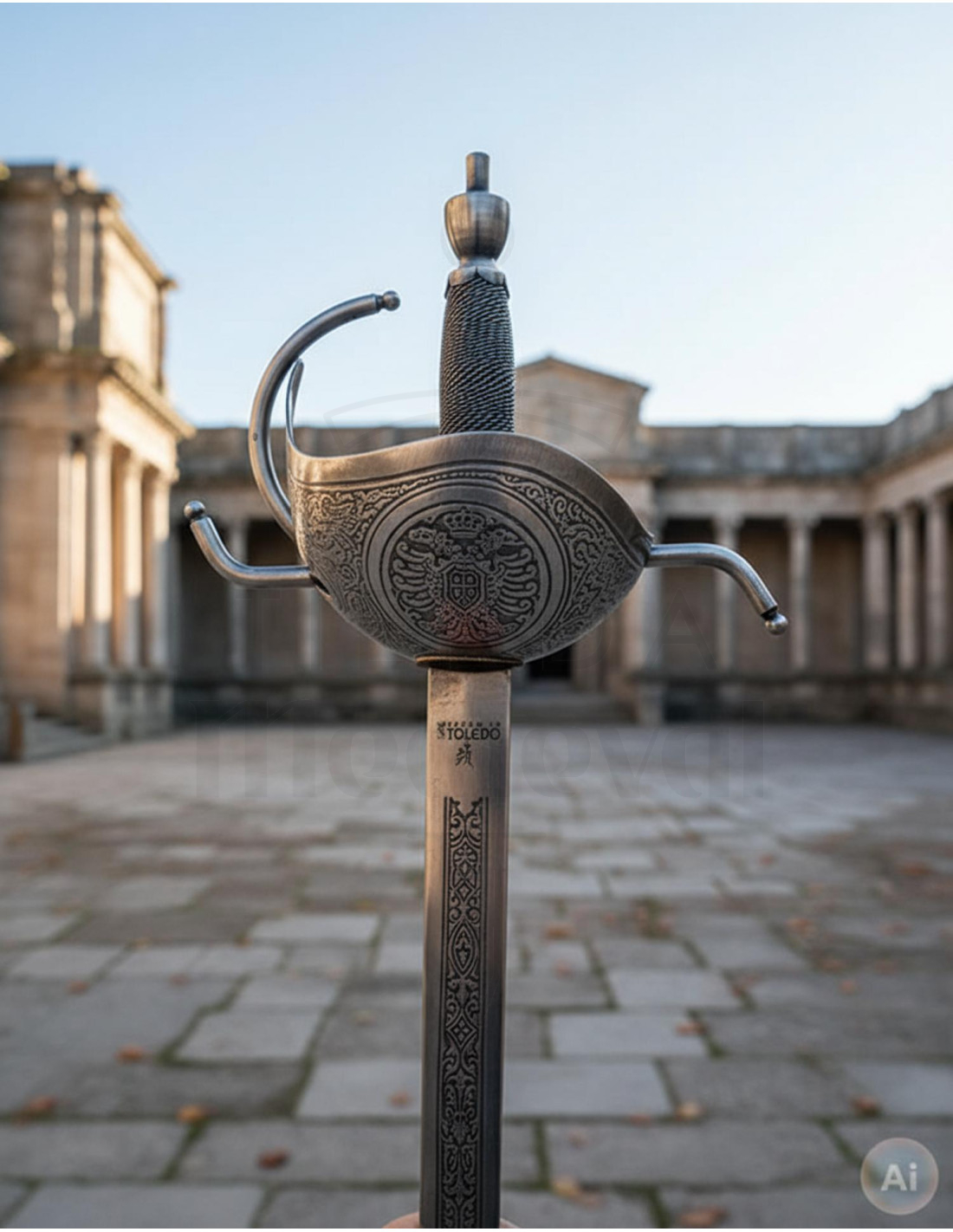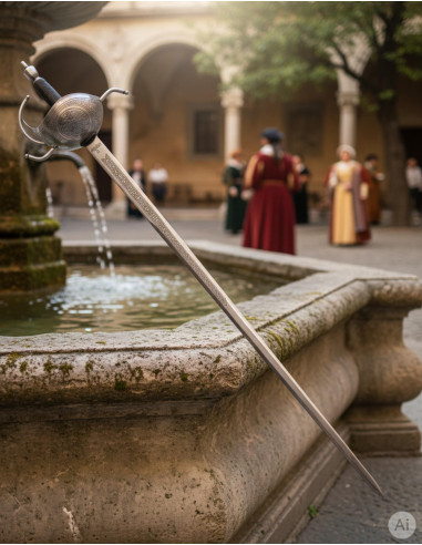 L'épée du roi Carlos III est fabriquée avec des matériaux de haute qualité. Sa lame en acier inoxydable garantit résistance et durabilité, tandis que son lieu de fabrication, Tolède en Espagne, est reconnu pour sa tradition dans la création d'armes de qualité.
