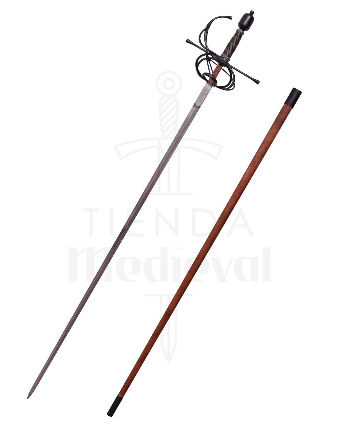 À la vue, l'épée révèle des lignes droites et une pointe aiguisée qui suggèrent une précision lors de l'estocade, accompagnée d'une garde à mailles qui protège la main et rehausse l'ensemble avec élégance. Le pommeau arrondi de ton sombre et la poignée texturée maintiennent la sensation de contrôle, et le fourreau rigide marron, avec renforts noirs, facilite le transport et permet de l'exposer fièrement dans n'importe quel espace.