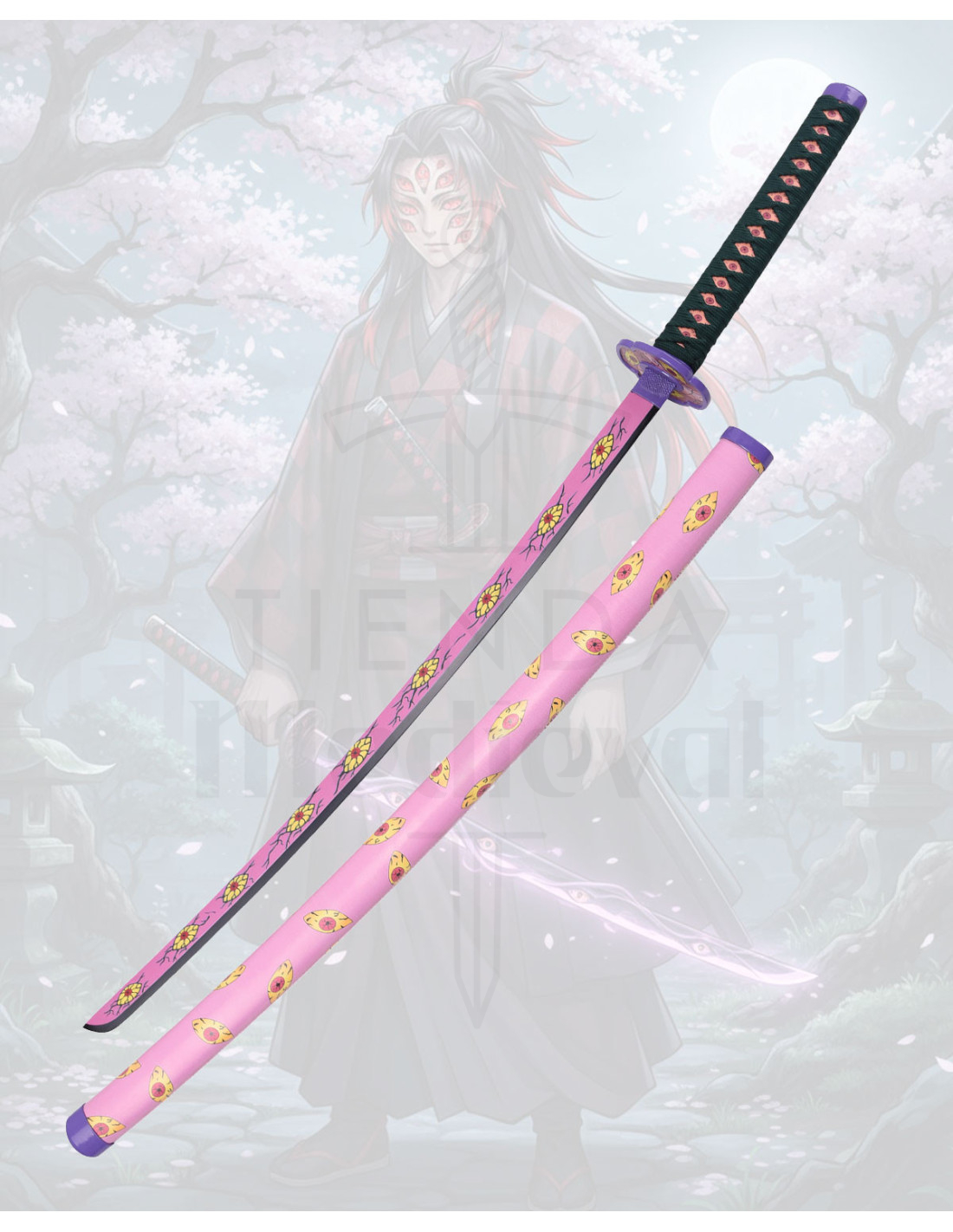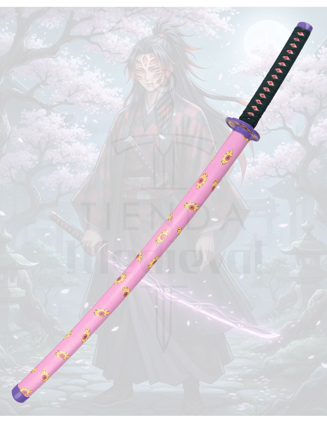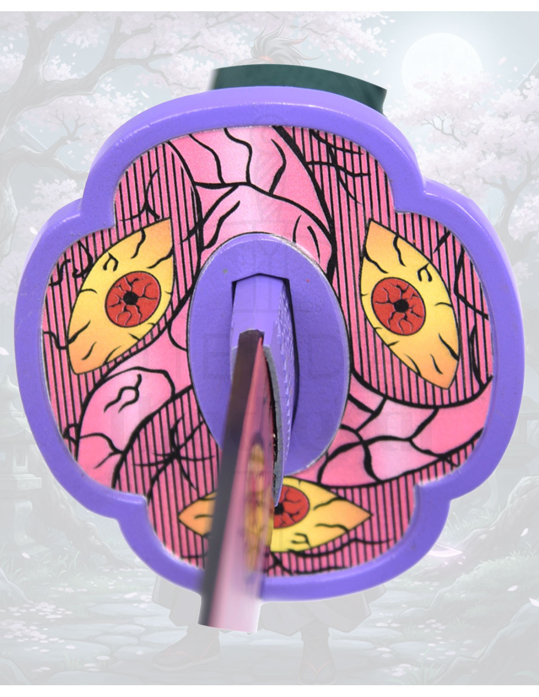 Cette réplique capture l'esthétique unique de Kokushibou sans perdre de sa personnalité: la lame rose décorée de motifs qui semblent des yeux jaunes et des touches rouges ajoute un contraste vibrant, tandis que le gainage violet du manche et les extrémités pourpres offrent une finition élégante et distinctive. La lame en acier, ornée de motifs roses et d'yeux jaunes, reflète l'intention artistique du design, offrant une pièce conçue pour être exposée et admirée.
