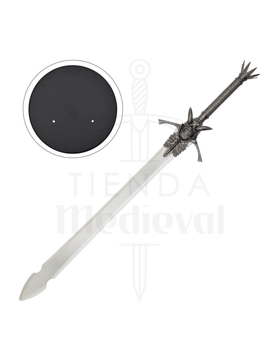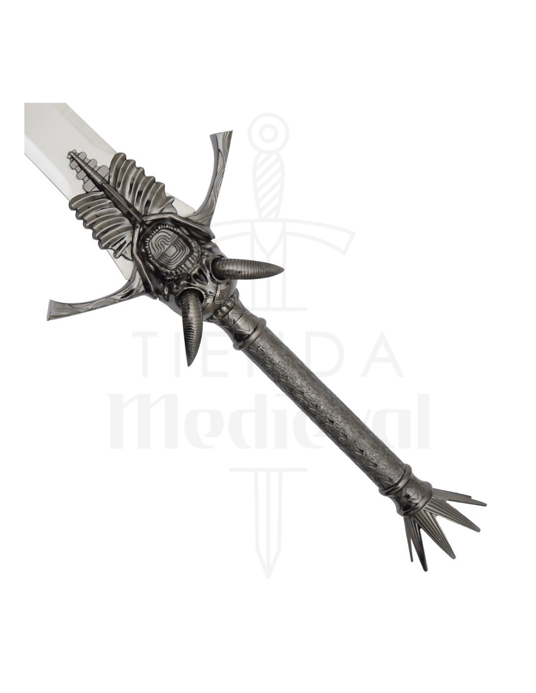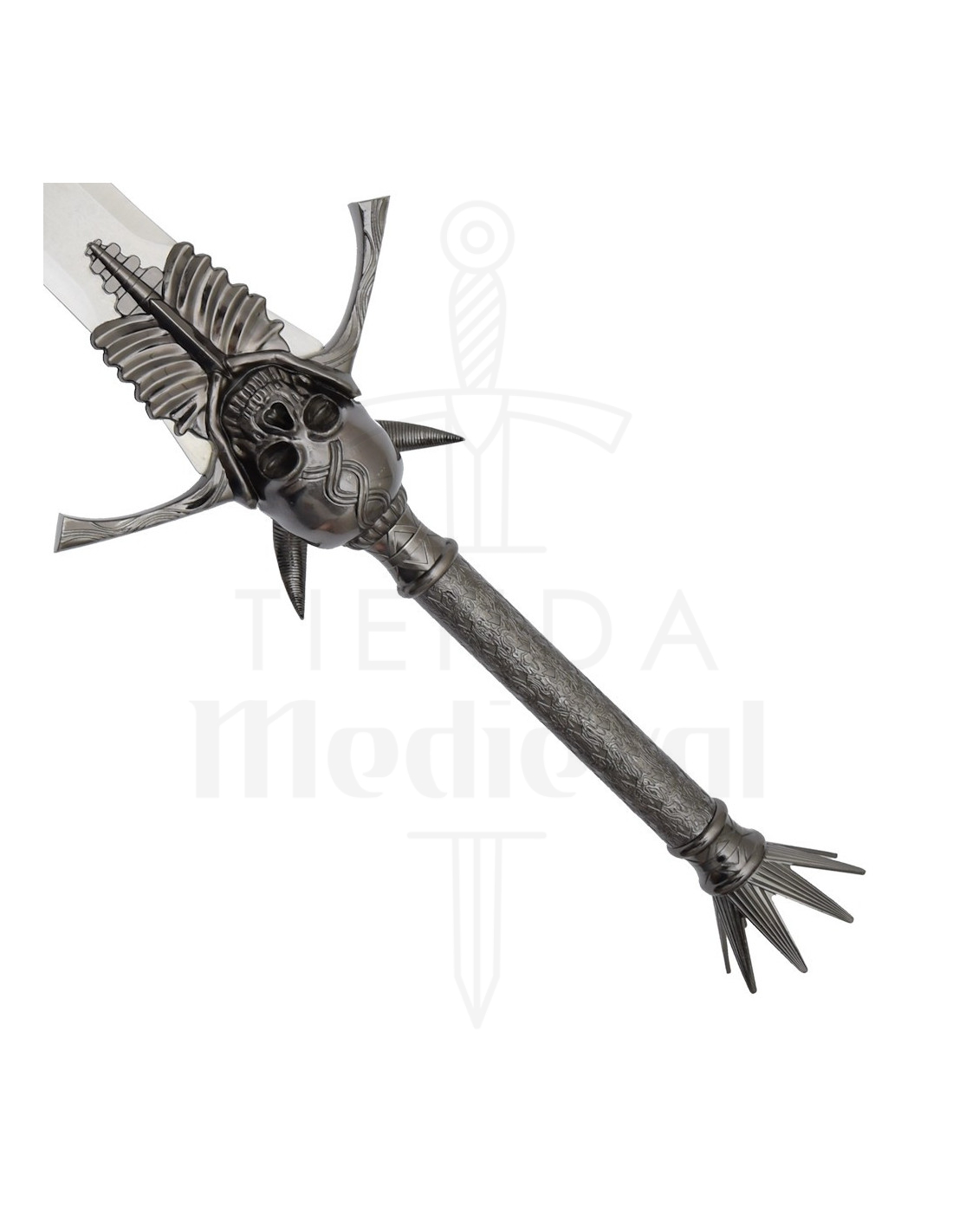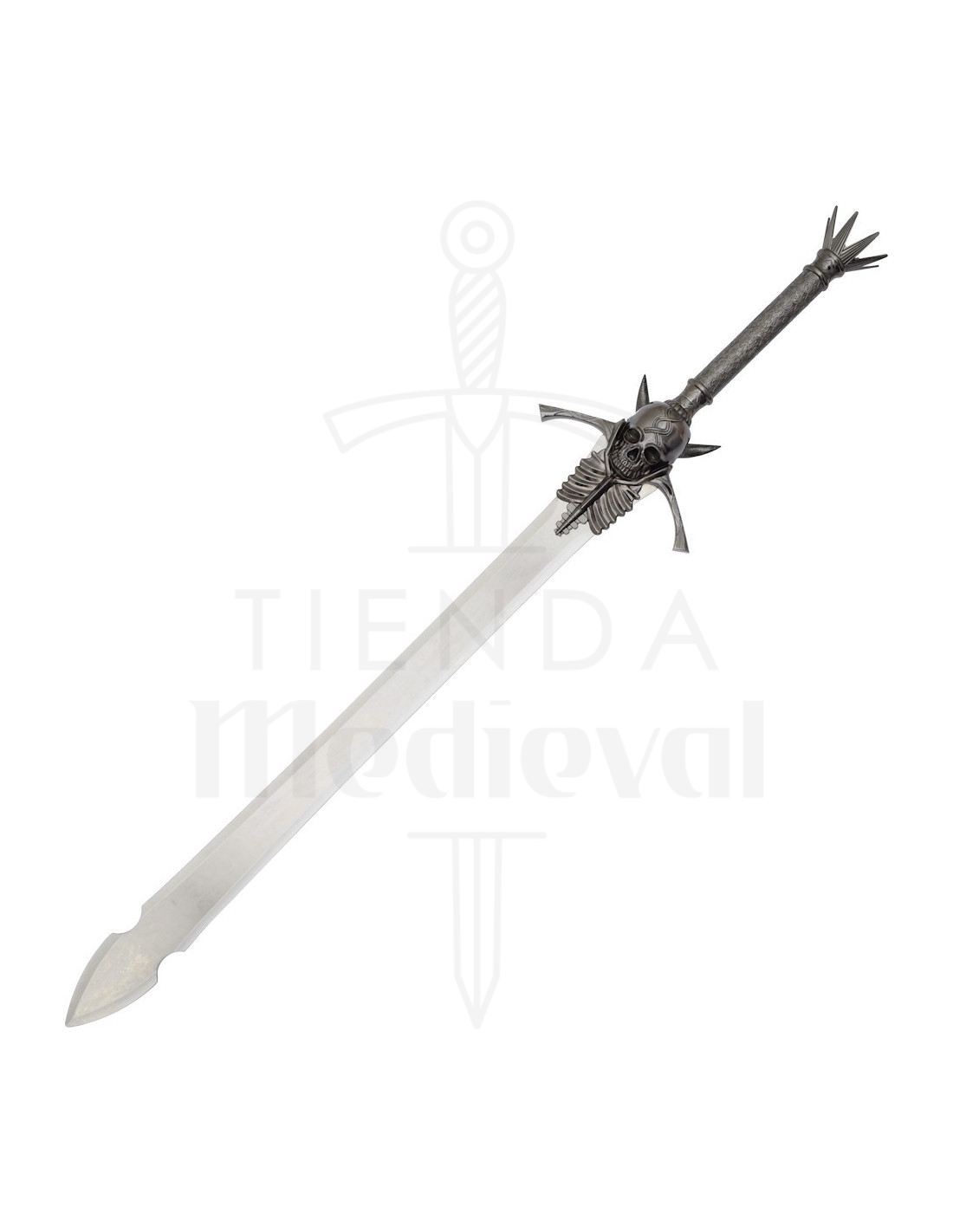 Le design n'est pas seulement esthétique, il facilite également l'expérience : la poignée sombre et texturée offre une prise ferme pour la poser ou la tenir en toute sécurité, tandis que la garde décorée avec crâne et côtes, et les pointes latérales, apportent du caractère et une sensation théâtrale qui rehausse chaque photo ou présentation. La couronne de pointes au sommet de la poignée ajoute cette touche dramatique qui définit son style gothique et décoratif.