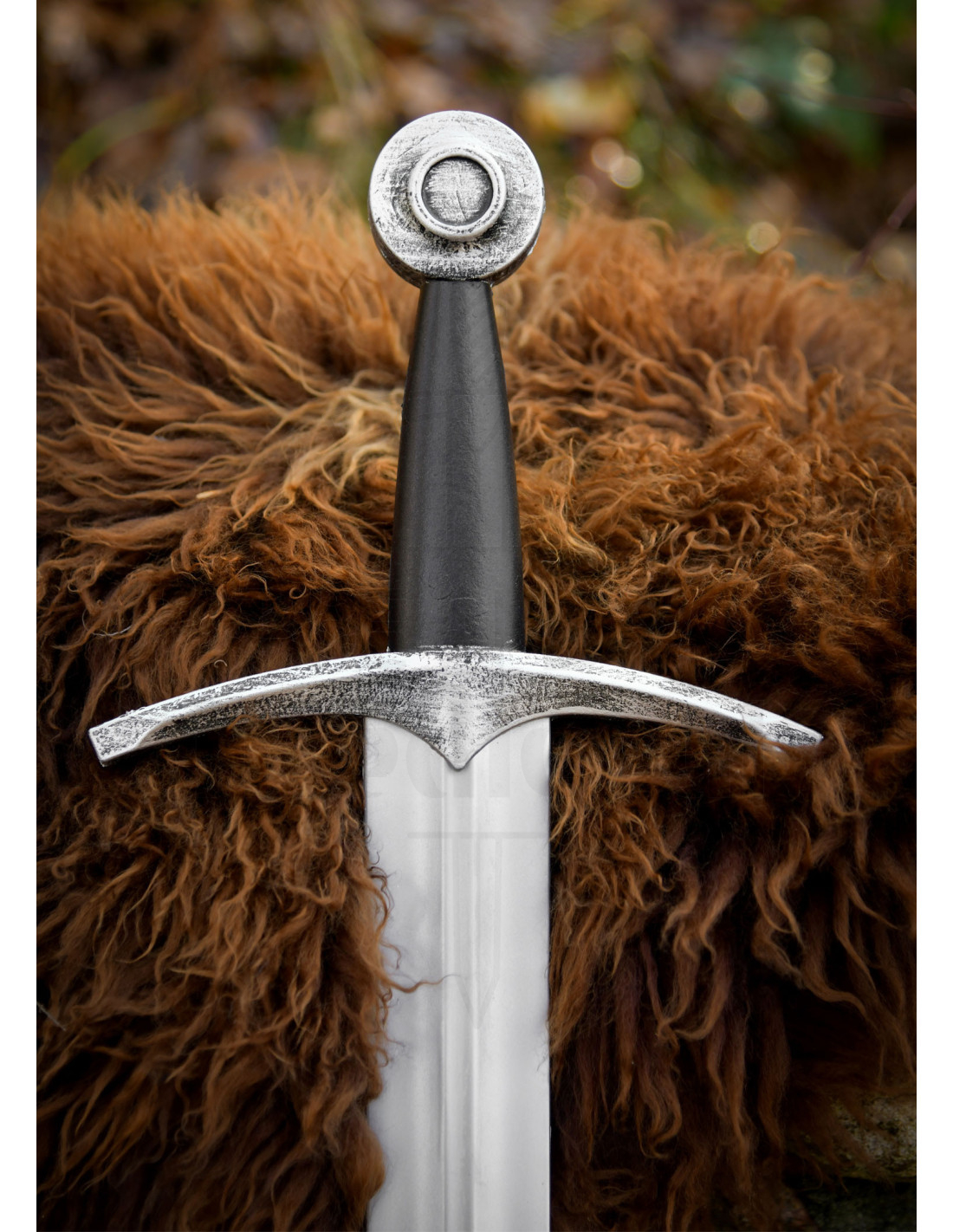 La poignée noire, lisse et confortable, assure une prise sécurisée même après de longues journées de jeu ou de représentation, vous permettant de maintenir la posture et la technique sans distractions. La garde à l'aspect vieilli avec de légères courbes et la monture ronde en finition argent vieilli complètent l'ensemble avec une touche classique, apportant une authenticité visuelle qui s'harmonise avec les chevaliers, les gardes royaux et les guerriers du haut Moyen Âge. La combinaison d'un design simple et d'éléments historiques fait que l'épée accompagne sans voler la vedette à votre personnage.