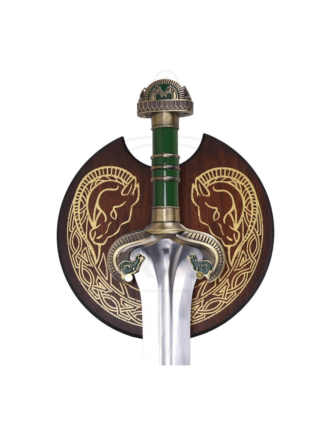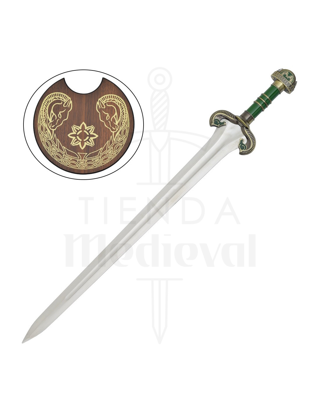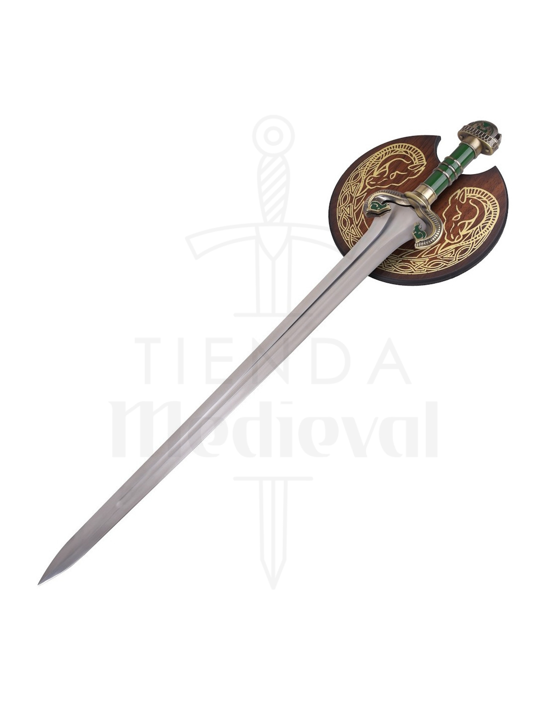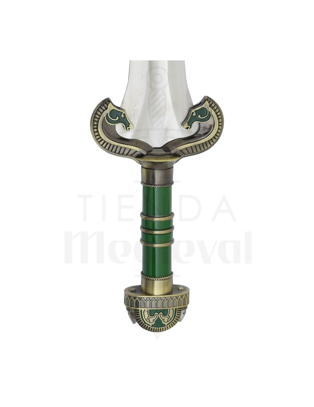Cette reproduction rend hommage à un moment héroïque, offrant une lame métallique polie à double tranchant qui reflète la lumière avec caractère, et une cannelure centrale qui renforce son aspect authentique et apporte un sentiment d'équilibre lors de son exposition. La poignée, dans une teinte verte avec des détails métalliques dorés, apporte un contraste raffiné qui rend la pièce captivante, tandis que la garde et le pommeau arrondi, décorés de motifs stylisés, transmettent une esthétique soignée qui évoque la noblesse et la détermination.