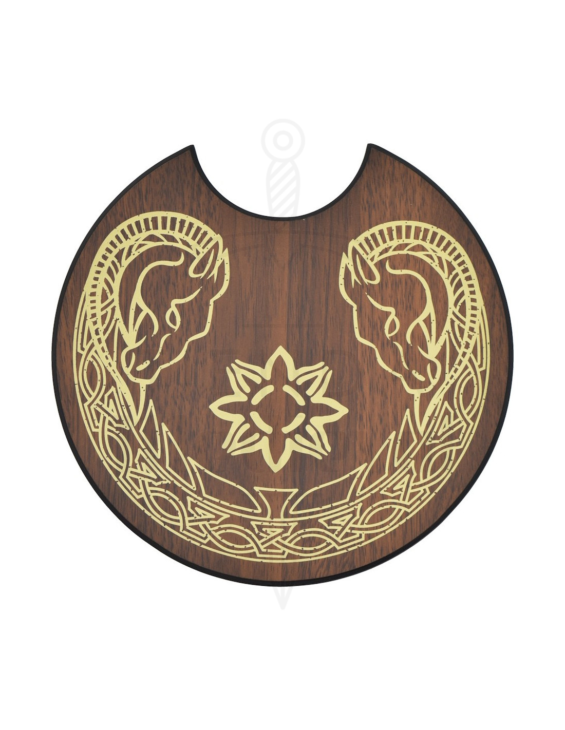 Le support inclus n'est pas seulement un accessoire, il fait partie de l'ensemble : bois sombre avec finition fine et ornements dorés, deux têtes affrontées et un motif central en étoile ou en fleur, qui maintiennent la pièce en position verticale et la transforment en un élément décoratif d'impact. Placer l'épée sur son support est simple, et l'ensemble prend de l'ampleur sans nécessiter un montage complexe.