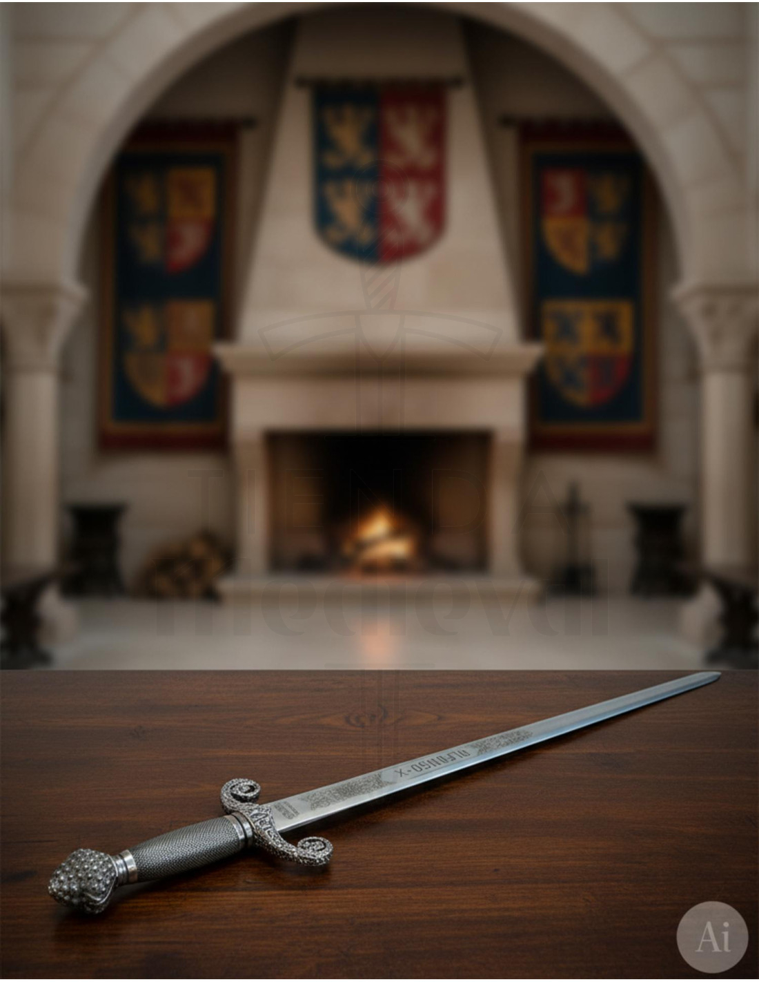 Découvrez l'épée d'Alphonse X, El Sabio ! Cette épée en argent est un véritable bijou, avec une lame en acier inoxydable gravée et une élégante poignée finition argent. Disponible en différentes tailles selon vos besoins : 56 cm enfant, 76 cm cadet et 102 cm naturel.