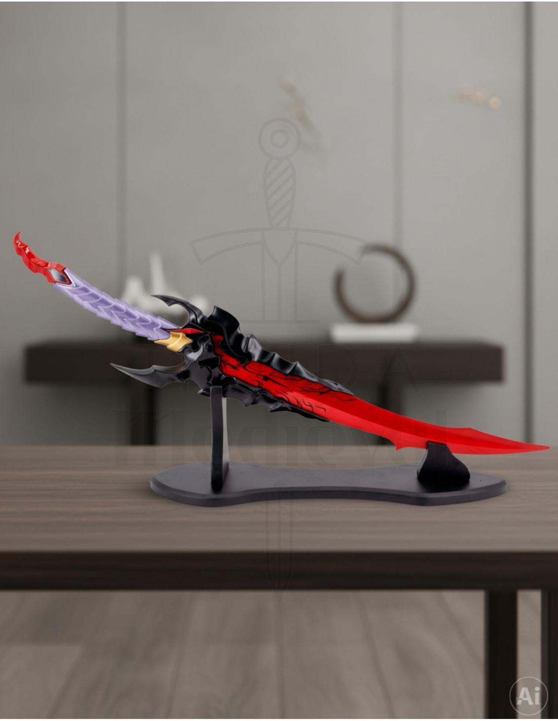 La lame, d'une épaisseur de 4 mm, possède une finition combinant des détails fins en noir et rouge, avec une base simulant des griffes ou des extensions, accentuant son caractère féroce. Elle inclut un support facilitant son exposition dans n'importe quel espace, constituant un complément idéal pour des décorations ou collections thématiques. Parfaite pour décorer votre chambre, bureau ou salle de jeux, cette pièce allie qualité visuelle et design percutant, spécialement conçue pour ceux qui souhaitent montrer leur passion pour Solo Leveling sans nécessiter de fonctionnalité de combat. L'image montre un objet avec un design élaboré et agressif, aux couleurs vibrantes et aux détails soulignant son caractère fantastique et héroïque. Procurez-vous cette épée décorative spectaculaire et apportez la force de l'univers de Kamish dans votre environnement !