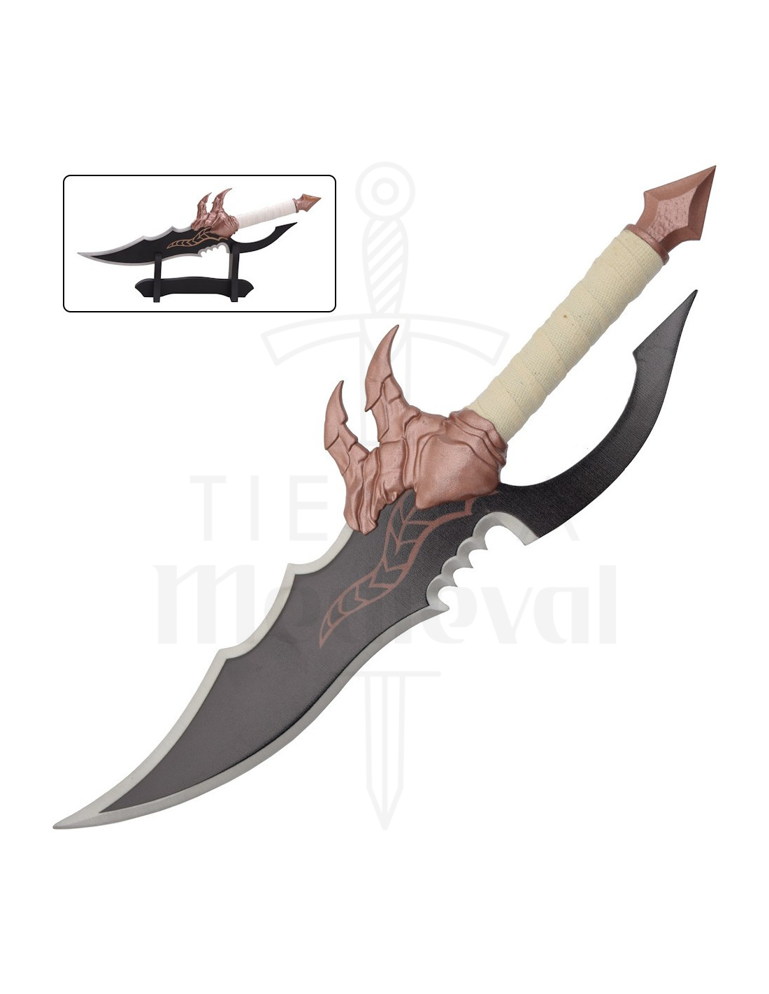 La sensation de solidité se perçoit depuis la garde en forme de griffes, jusqu'à la pommeau pointu, transmettant une esthétique de créature mythique qui amplifie le caractère décoratif. La poignée enroulée de corde claire offre une prise texturée, facilitant sa manipulation occasionnelle et ajoutant un contraste visuel avec les tons métalliques.