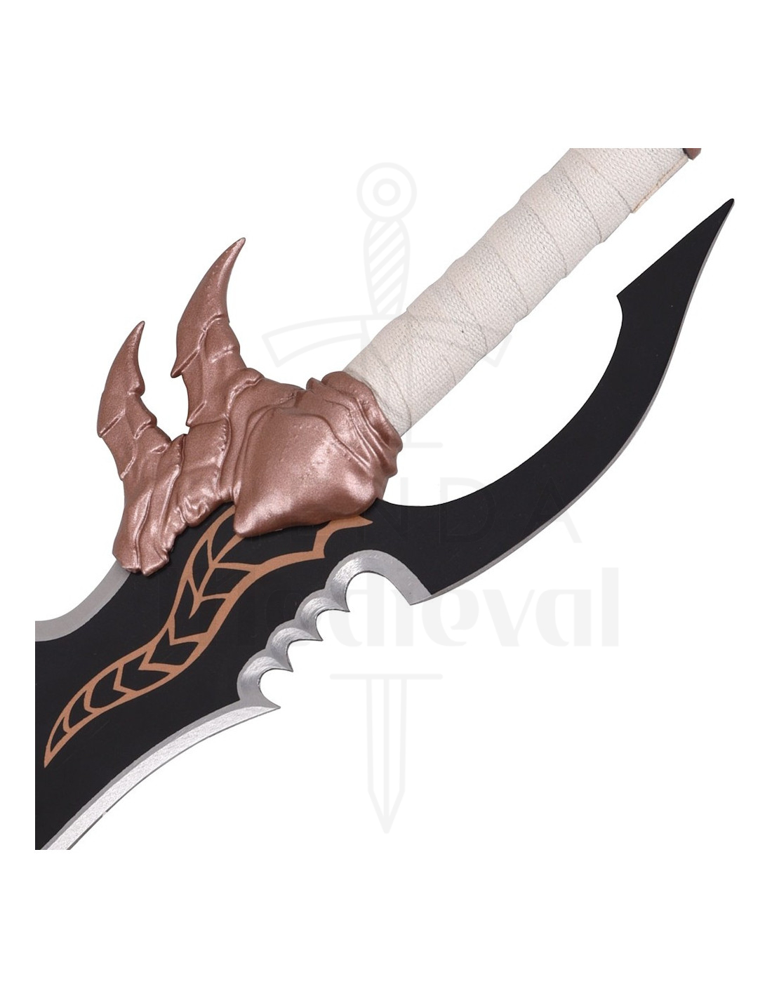Le design irrégulier de la lame, avec des bords ondulés et des dents de scie, donne un aspect agressif qui semble tout droit sorti d'une scène épique. Ce fini noir avec des touches de cuivre lui donne une profondeur visuelle, faisant en sorte que chaque angle révèle de nouveaux détails, parfait pour ceux qui recherchent une pièce de collection qui se démarque sans effort.