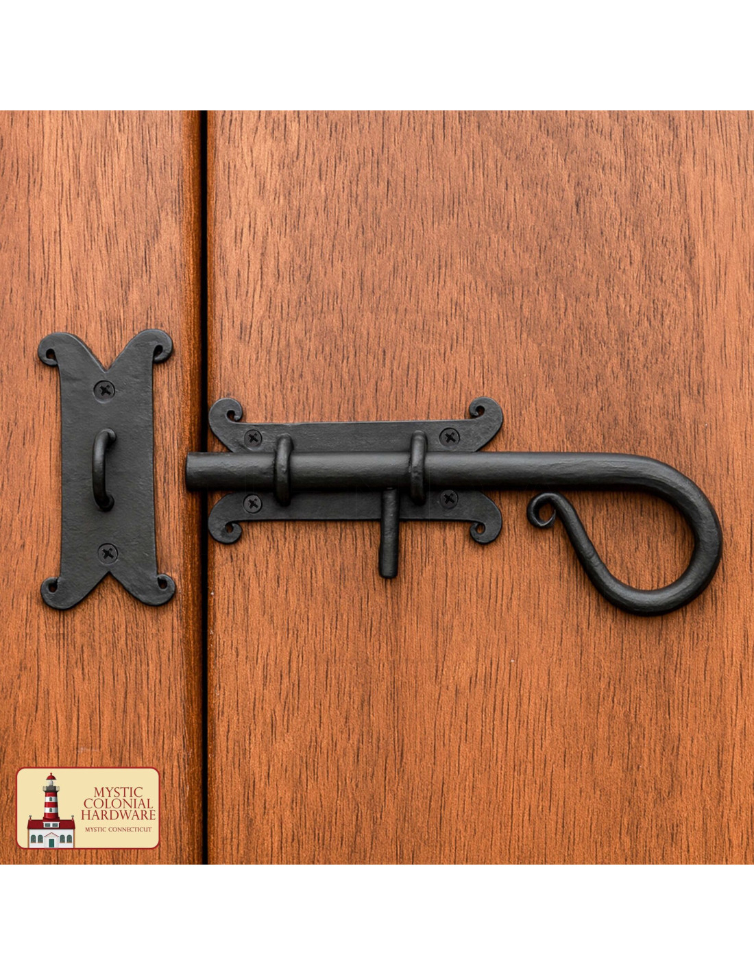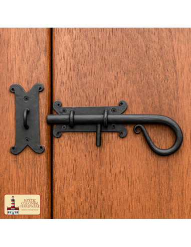 Le design inclut des plaques décoratives en V avec des extrémités bouclées et une poignée en spirale facilitant la prise en main, ce qui rend son utilisation confortable et précise, même avec des gants ou des mains humides. Le pêne glisse en douceur dans ses anneaux, étant fermement retenu par la broche centrale, transformant une simple action en une sensation de fermeture sûre et durable.