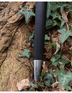La structure interne en bois recouvert offre une prise ferme qui protège la lame et maintient une silhouette élégante, tandis que l'extérieur en ton noir apporte cet aspect classique et résistant. Les finitions avec pointe métallique et les coutures renforcées non seulement décorent, elles prolongent également la durée de vie utile et évitent l'usure aux points de frottement les plus importants, pour que vous puissiez l'utiliser lors de présentations et de reconstitutions en toute confiance.