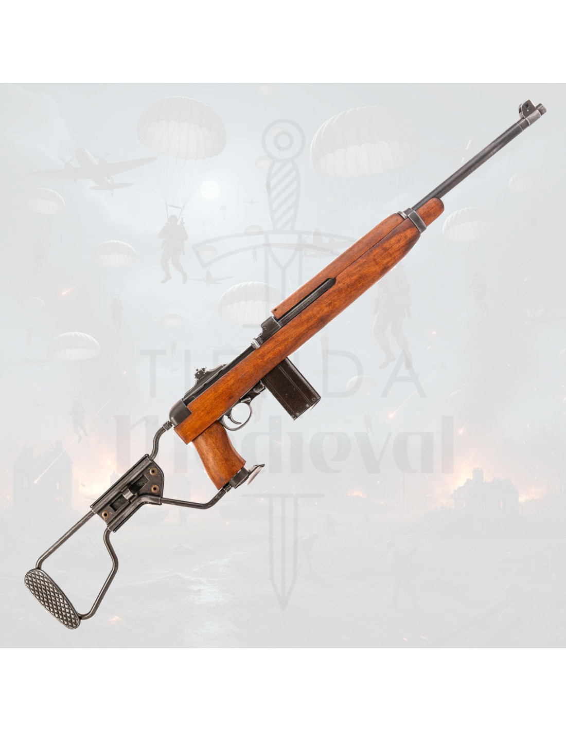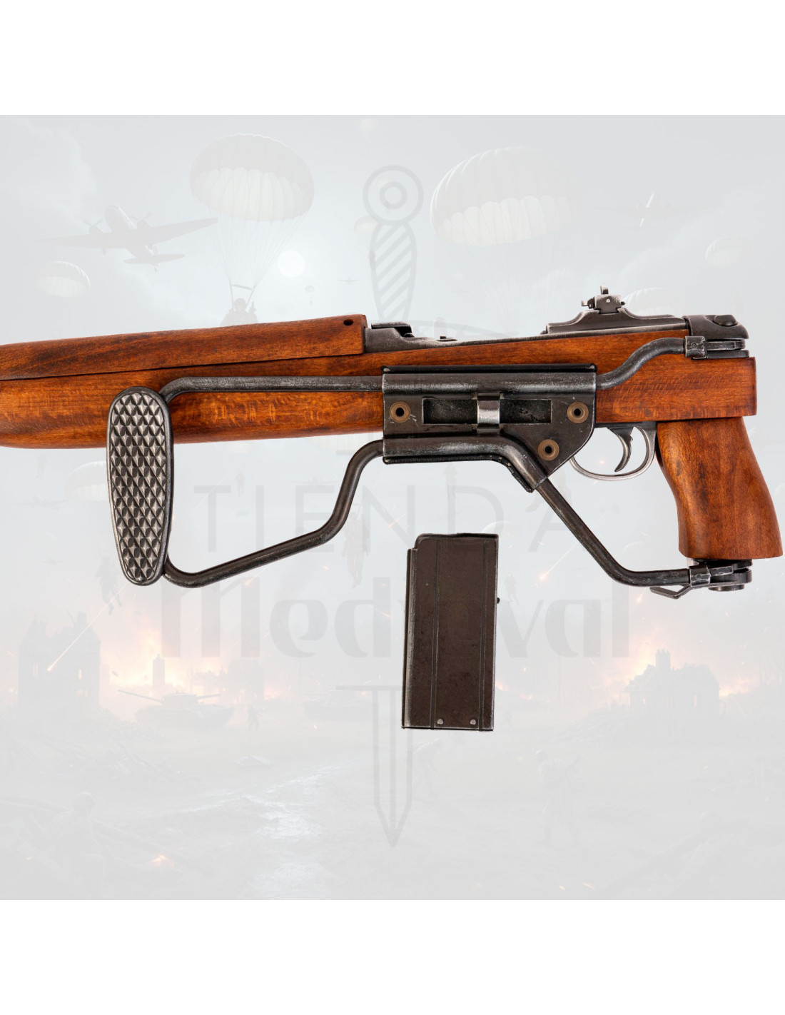 Cette Réplica de la Carabine M1A1 modèle parachutiste avec crosse pliante, USA 1941 (2ème Guerre Mondiale) offre une expérience tactile et visuelle qui convainc les collectionneurs et passionnés : un corps métallique sombre qui transmet solidité, des pièces en bois avec une finition naturelle qui apportent chaleur et une crosse pliante métallique qui facilite le transport et le stockage, en plus de permettre une présentation compacte et authentique.