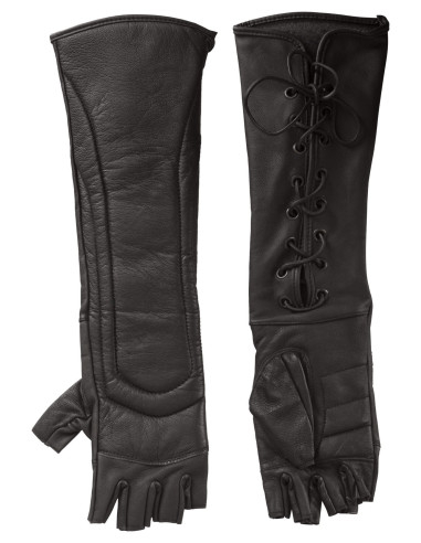 Avec un design long qui s'étend jusqu'avant-bras et un système de cordons ajustables, ces gants garantissent un ajustement confortable et personnalisé. Leur finition en cuir doux et flexible apporte non seulement un aspect authentique, mais facilite également la mobilité et la dextérité à chaque mouvement, idéal pour des personnages de fantasy, des explorateurs en LARP ou pour compléter un look steampunk.
