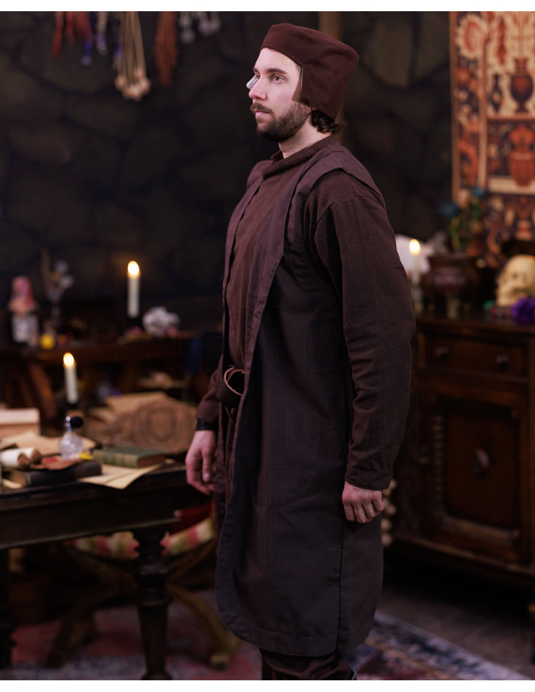 Sur l'image, on voit comment le gilet s'intègre au look complet : une tunique à manches ajustées, une large ceinture noire qui définit la taille, un pantalon assorti et un simple bonnet, créant un ensemble cohérent de tons marron foncé qui fonctionne tant pour des scènes de fantasy que pour des reconstitutions historiques.