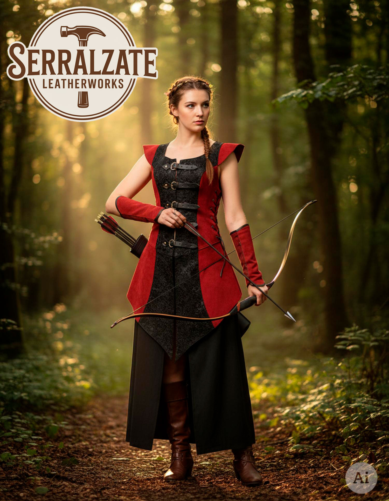 Robe de guerrière médiévale Ingrid en cuir, rouge et noir