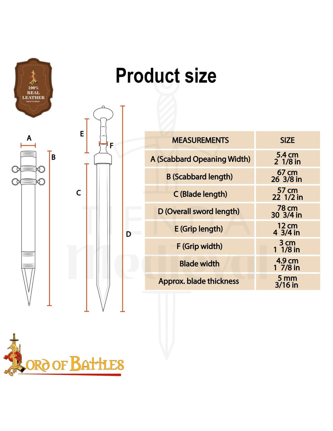 Le fourreau noir avec des détails dorés transforme la présentation en un clin d'œil historique, sa pointe métallique triangulaire et les anneaux dorés ajoutent cette touche cérémonielle qui la rend parfaite pour être accrochée à une ceinture ou placée comme pièce centrale dans une collection. Les finitions brillantes contrastent avec le cuir noir, se distinguant dans n'importe quel environnement thématique ou décoratif.