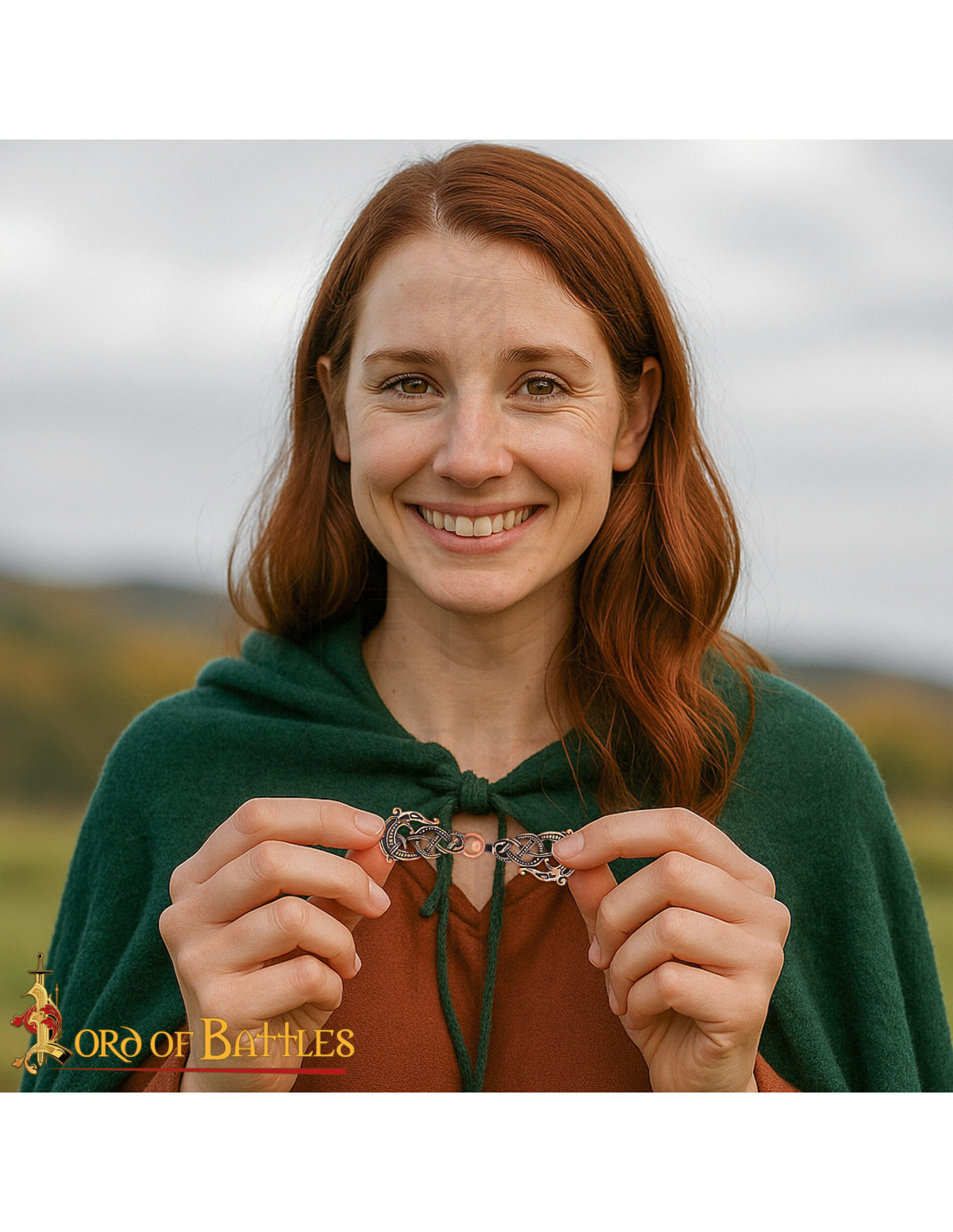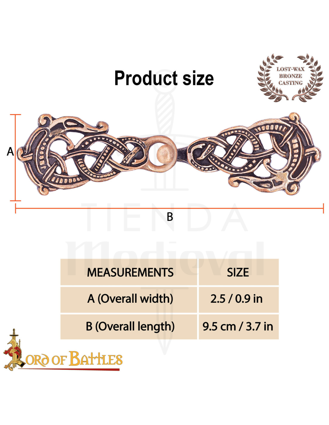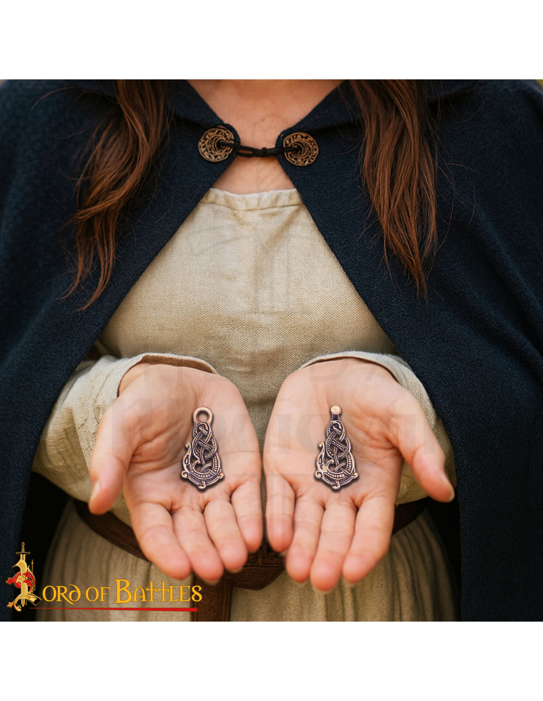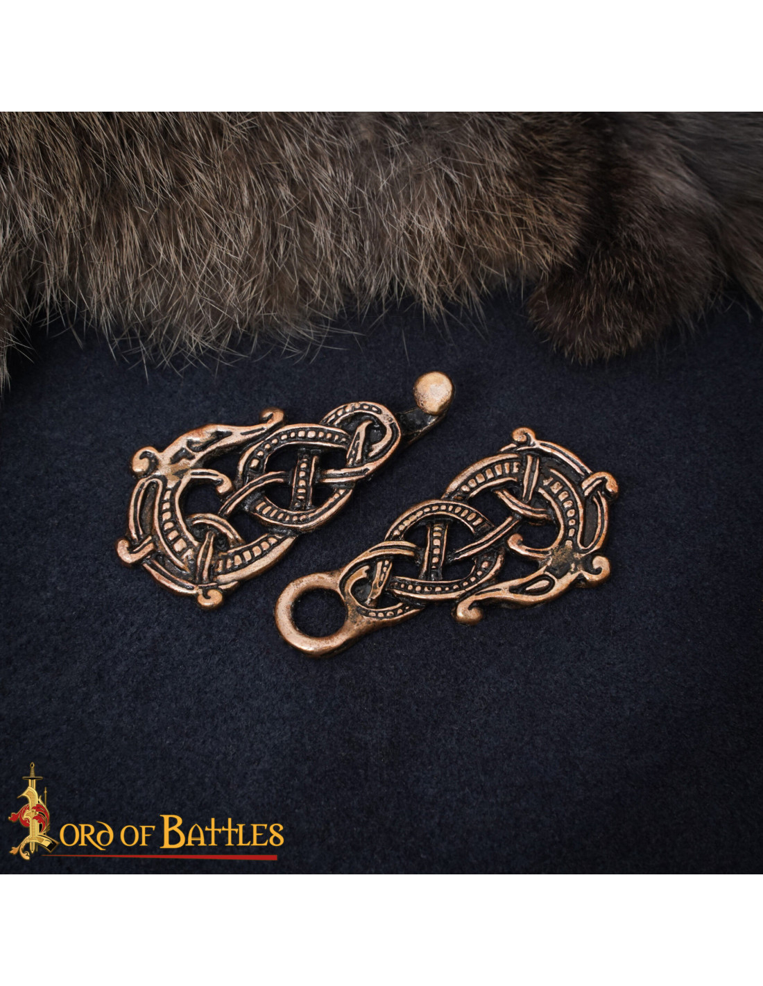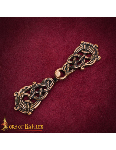 À la surface, les tons cuivrés et noirs rehaussent le relief et les points qui décorent le corps entrelacé, tandis que les deux têtes de dragon aux extrémités apportent un symbole de force et de protection, tant apprécié dans la scénographie nordique des 9ème et 10ème siècles. Si vous appréciez la fidélité historique, cette fermeture évoque les pièces qui accompagnaient les chefs, commerçants et marins scandinaves de l'époque.