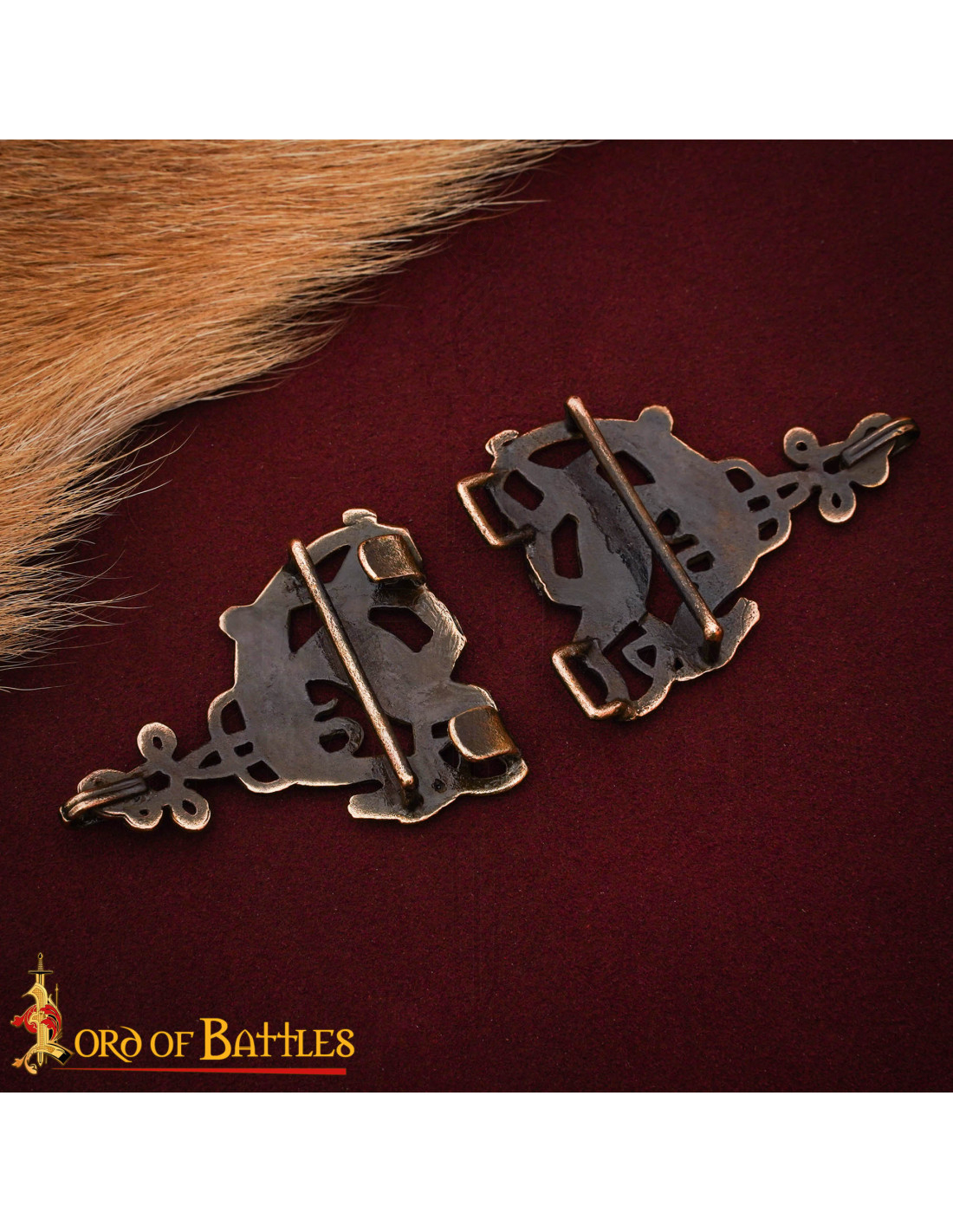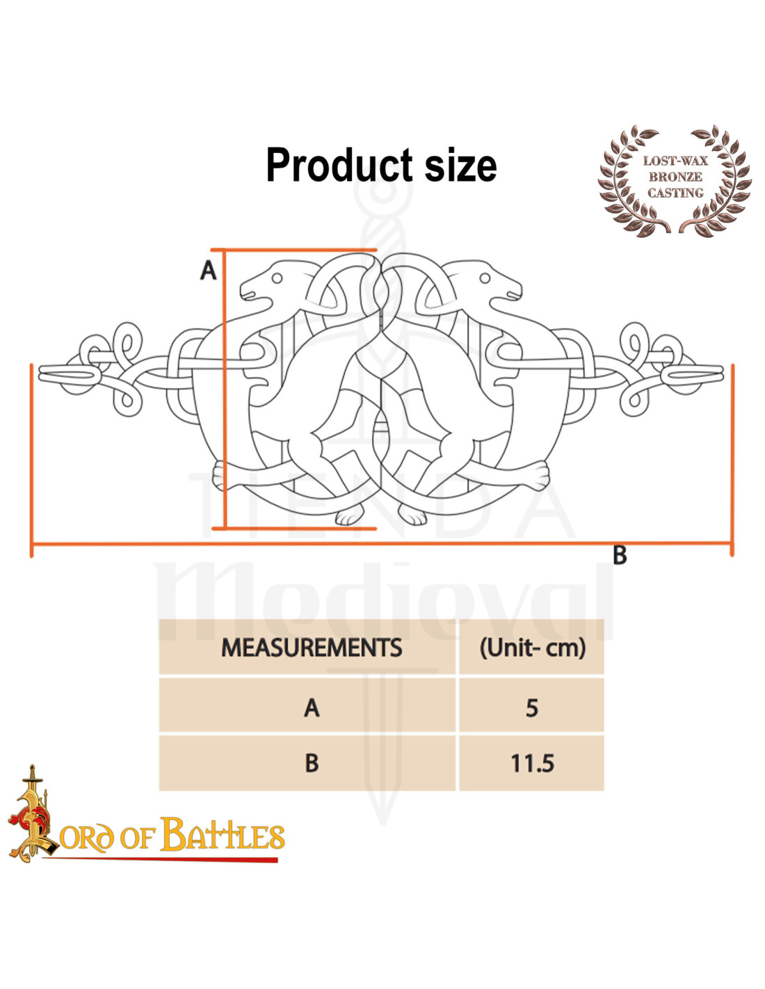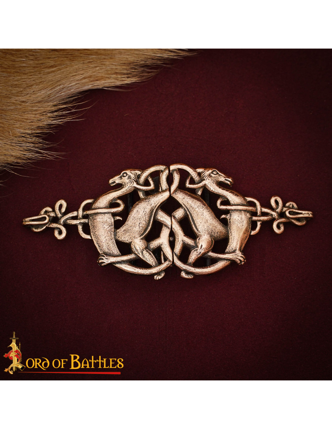Avec un motif celtique de cerfs entrelacés, les figures face à face et le tissage travaillé des nœuds transmettent mouvement et élégance, tandis que les lignes qui simulent une texture rappellent la peau et le pelage stylisé des anciennes pièces médiévales. Sur la photographie, l'éclat mat du bronze sur un tissu bordeaux intensifie sa présence, le faisant ressortir même dans des scènes austères.